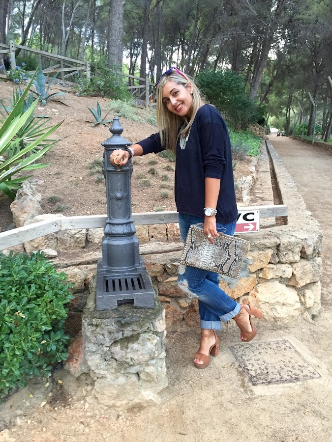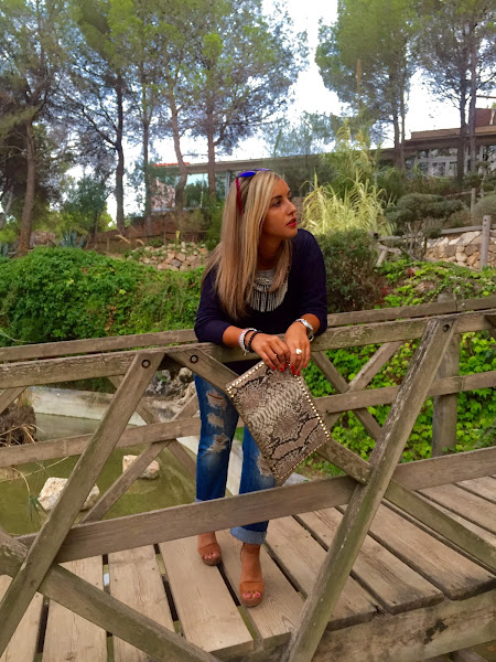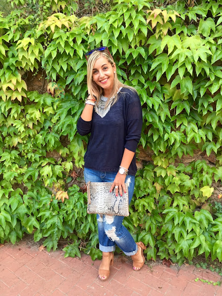 Parece que el verano esta llegando a su fin, ya que las temperaturas han bajado. Para esta época del año, una de mis prendas básicas son los jeans. Hoy os enseño un look con mis tejanos boyfriend, que se han convertido en unos de mis favoritos, que combiné con una camiseta básica gris y un jersey finito de punto azul marino. Los accesorios del look, mi collar boho, sandalias beige y mi bolso de mano de estampado de serpiente. Un look casual y chic.