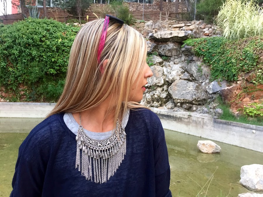 It seems that the summer is ending, because the temperature goes down these days. For this period of the year, one of my basic clothes are the jeans. Today I show you an outfit with my boyfriend jeans, which are my favourite, with a grey basic tee and a blue knitted sweater. The accessories of the outfit were my boho necklace, beige sandals and a handbag with animal print. A casual and chic outfit.