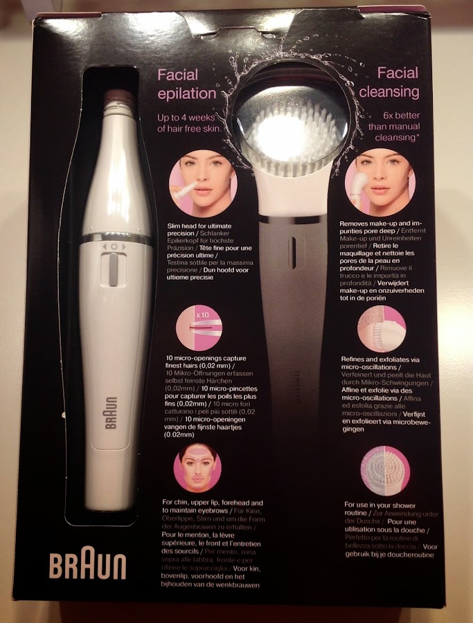 Lo primero de lo que os voy a hablar es de la presentación, como podéis ver en la imagen de arriba viene en una caja, en la que vemos el dibujo de un rostro de una chica y el aparato en si, con el cabezal de depilar colocado y el de limpiar el rostro al lado.