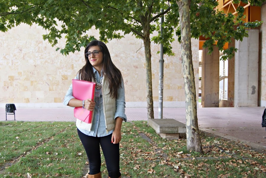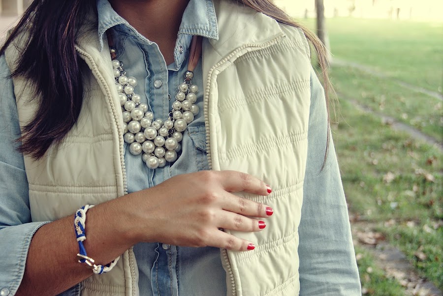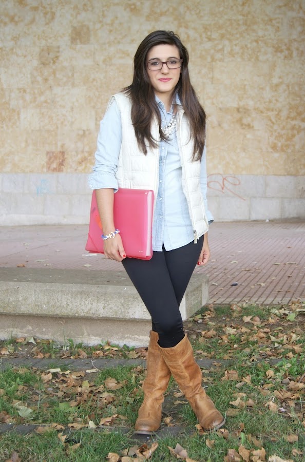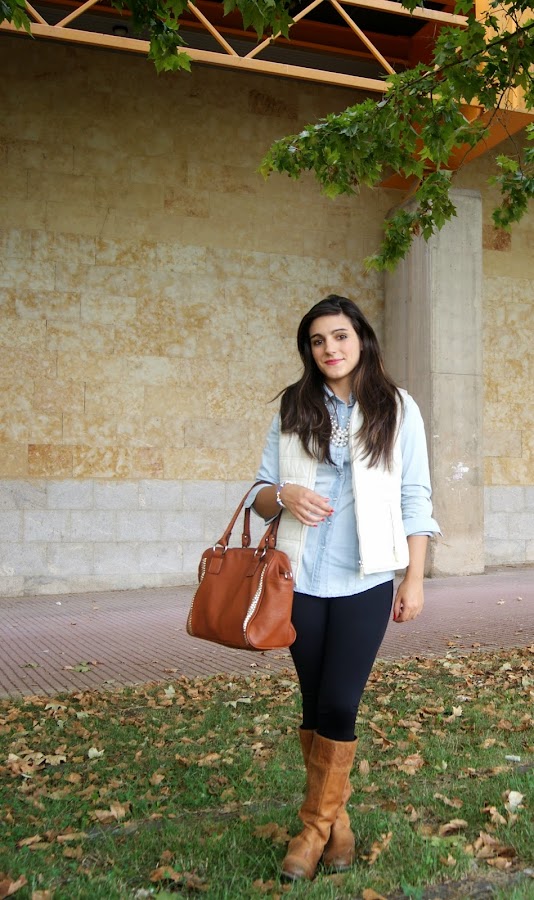 Yo opté por un outfit de inspiración preppy. Se compone de camisa vaquera, chaleco, leggings negros, botas marrones, bolso marrón, pulsera náutica y collar de perlas. Es apto para los primeros días de otoño en los que no hace calor pero tampoco demasiado frío. El look es bastante clásico, mezclando lo elegante con lo casual. Ante todo, es cómodo.