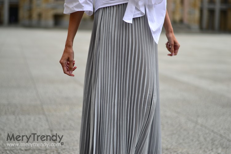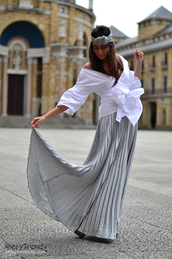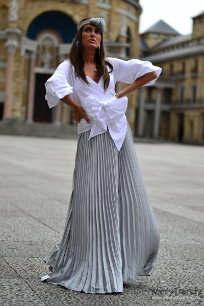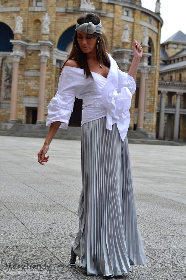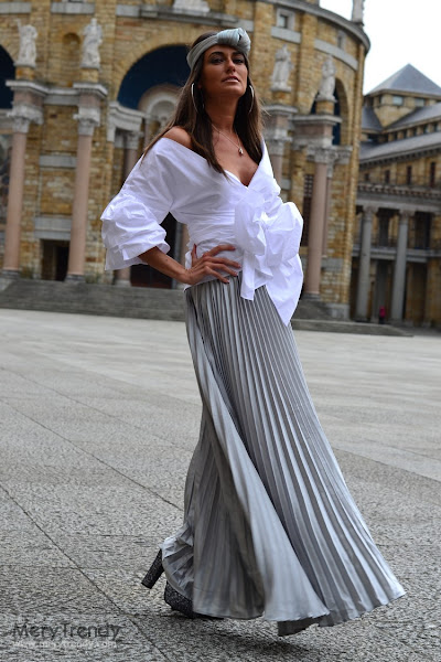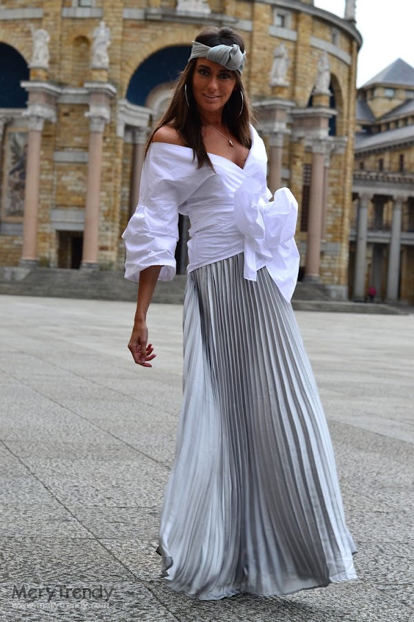 Hoy miércoles os acerco un look formado por dos piezas de SheIn que están pegando fuerte esta temporada. Por un lado, una blusa blanca para llevar los hombros al aire (y presumir de bronceado) con cierre de lazada cruzado y varios volantes en cascada en las mangas y por el otro, una maxi falda plisada con diseño plateado metálico que, si recordáis, ya revoloteaba por las tiendas hace un par de temporadas en versión midi. Si bien es cierto, que, bajo mi punto de vista, las faldas largas desprenden más sofisticación.
