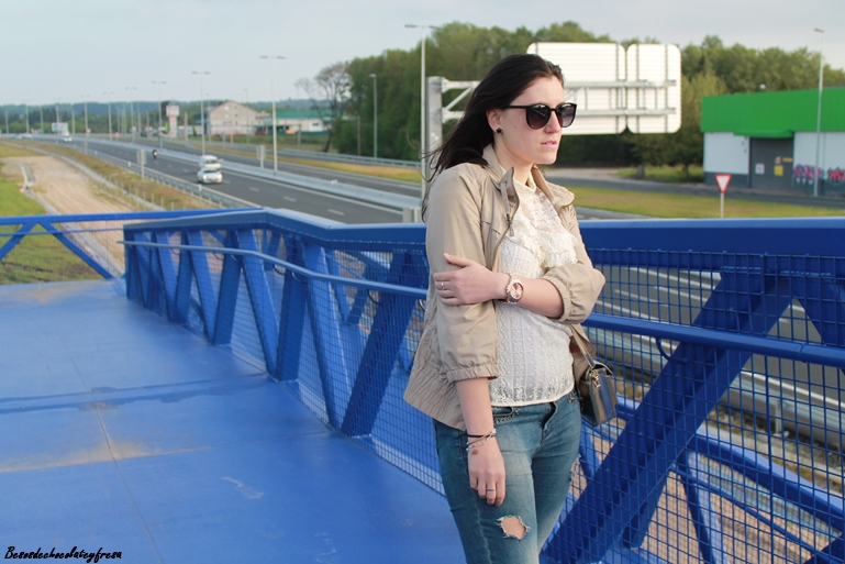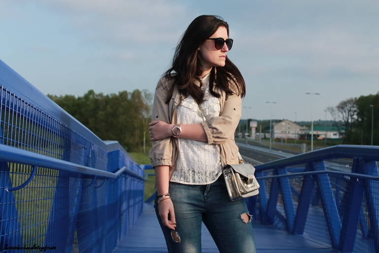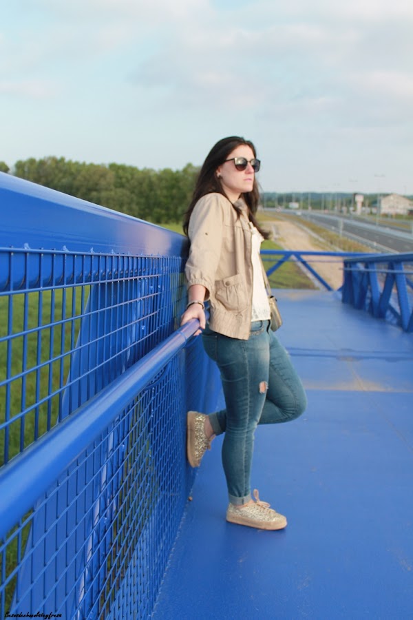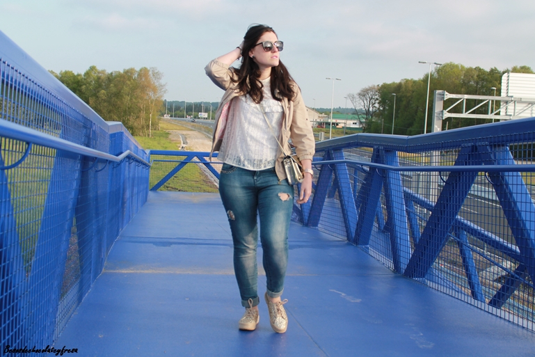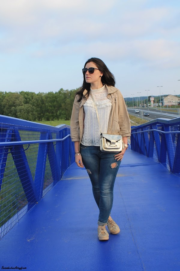 I combined them with a simple look, jeans, white blouse, lace in nude and gold shoes matching bag.