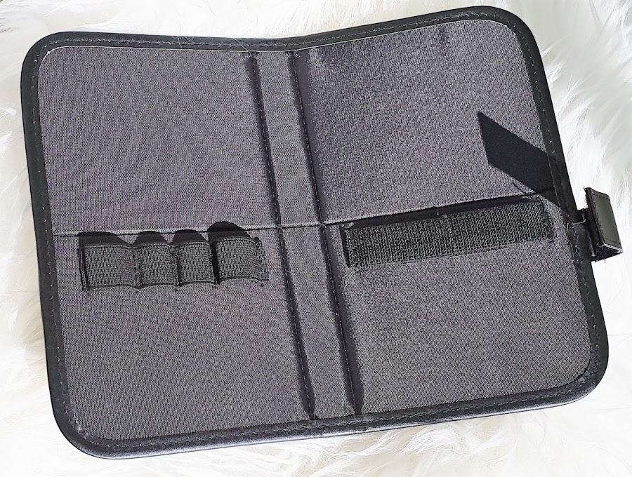 La goma para meter las brochas, la de la parte derecha, como es donde se meten las grandes, para no estropearlas, se abre con velcro, se mete la brocha y se cierra, quedan perfectas sin forzarlas y protegidas.