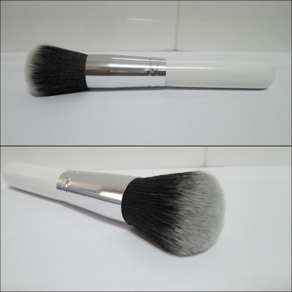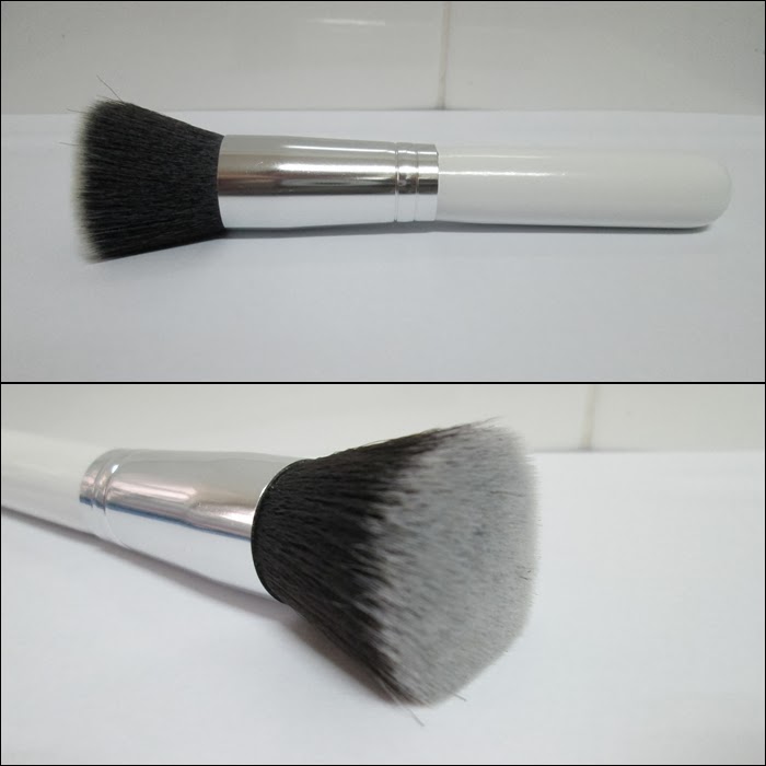 La brocha de corte plano, pensé que sería más tupida, la verdad... En realidad si es tupida, pero tiene el pelo demasiado separado, como endeble, por lo que a la hora de utilizar la base mineral no cubre mucho. En parte, me viene genial, ya que la base mineral de "Lucy Minerals" es muy cubriente y con esta brocha puedo graduar el acabado que quiero, aunque creo que si usáis base de maquillaje fluidas no os agrade mucho, porque no cubriría apenas...
