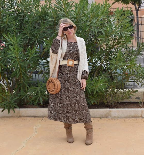 En esta ocasión lo he combinado con más tonos marrones y colores crudos, con una chaqueta de mangas murciélago y pequeñas lentejuelas que tengo hace años!
