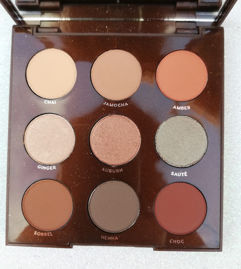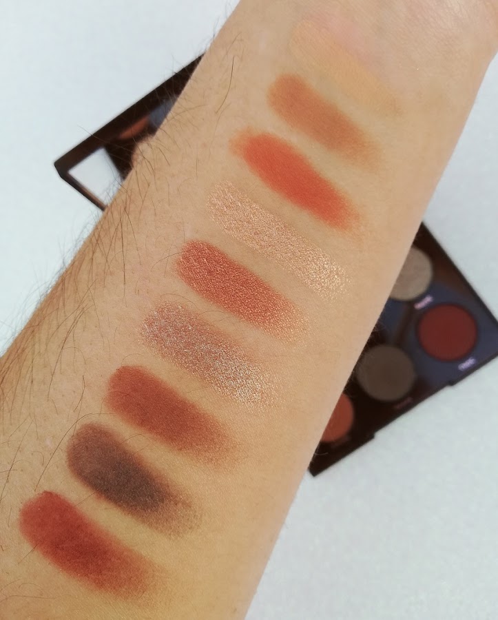 Y en la parte inferior encontramos nueve preciosas sombras en tonos cálidos que van desde vainilla, anaranjado, tierra, chocolate, incluso marrón grisáceo. Seis de ellas son de acabado mate y las otras tres, situadas en la parte central de la paleta, son de acabado brillante.