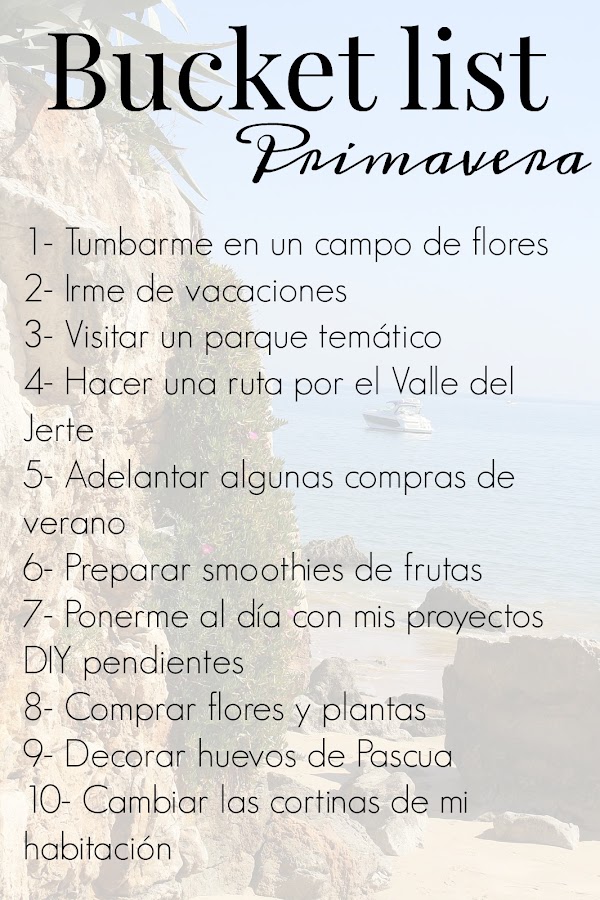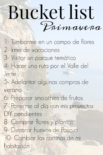 Como llevo haciendo desde otoño, he elaborado una lista de cosas por hacer en primavera. Tengo muchas ganas de viajar, de hacer rutas por la naturaleza, de aprovechar que hay más variedad de frutas para preparar smoothies para el desayuno, de llenar mi vida de flores, de terminar proyectos... El buen tiempo nos anima a hacer más cosas, así que yo espero que el sol me inspire y me dé toda energía necesaria para hacer todo esto realidad.