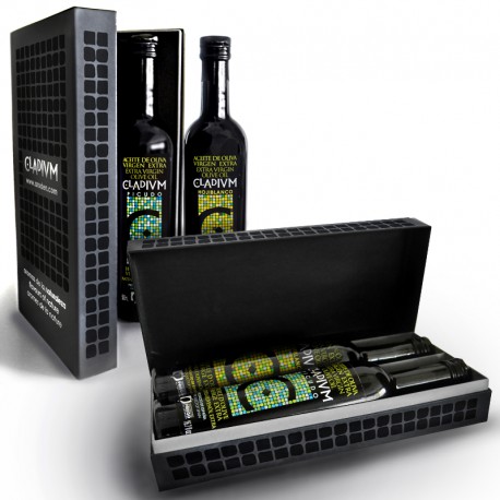 El Estuche Regalo Claudium. estuche regalo de Aceite de Oliva Virgen Extra de alta calidad Cladium, para exigentes gourmets que degustan del exquisito aceite de oliva virgen extra. Dos excepcionales aceites de oliva premiados internacionalmente, juntos en un elegante estuche regalo.
