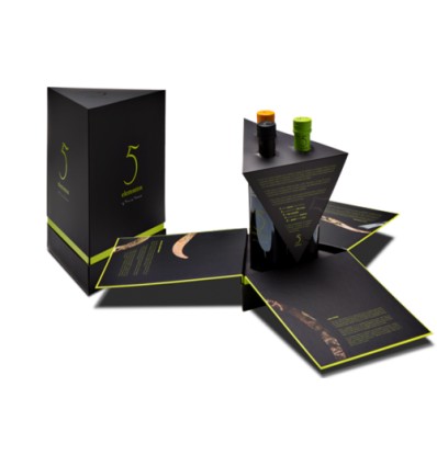 Primero quiero mostraros los 5 elementos en estuche regalo. Selección de los mejores aceite de oliva virgen extra, premiados internacionalmente en la "New York International Olive Oil Exhibition" la feria más importante del mundo sobre el Aceite de Oliva. Sólo los mejores están ahí.