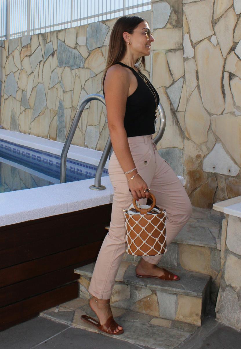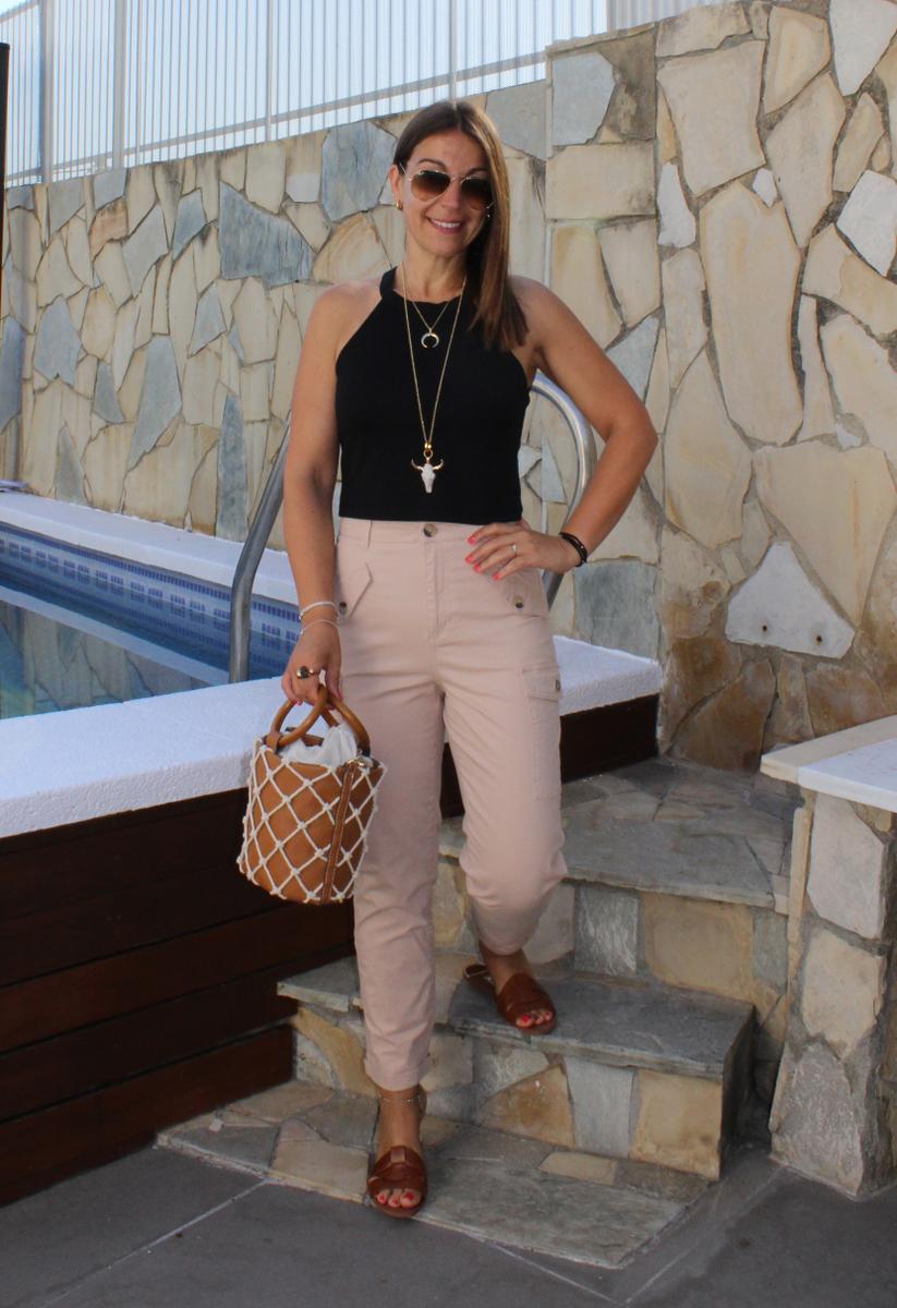 El look de hoy, esta compuesto por unos pantalones cargo en color arena claro, que como os comentaba hace unos días, se han convertido en unos indispensables de este verano, crop top con cuello halter en color negro sobre el cual llevo los collares que han dado nombre a este post, uno de cuerno y otro de cabeza de búfalo/bisonte ( no tengo muy claro que animal es, jajajajaja). A los pies una palas en color marrón y un bolso de red, que si hacéis memoria fue uno de los hits de la primavera/verano 2018.