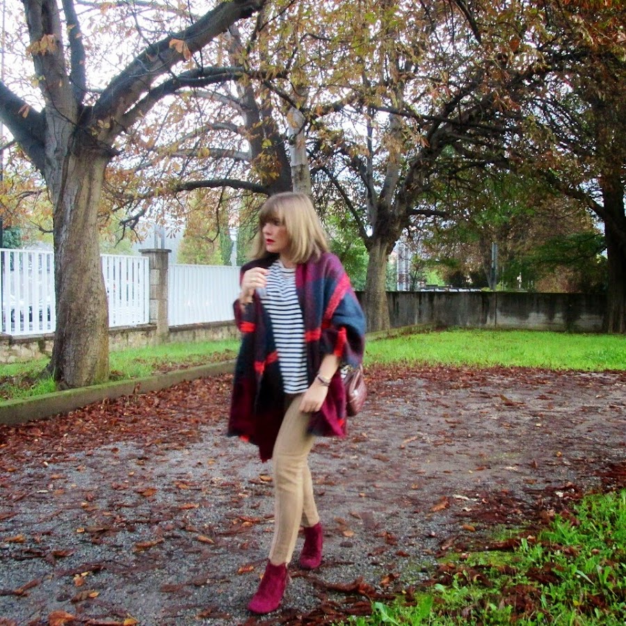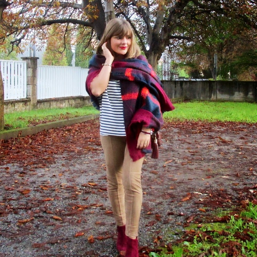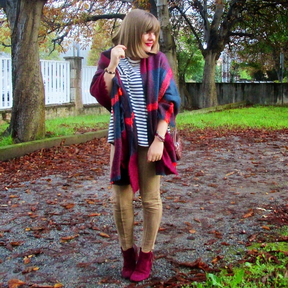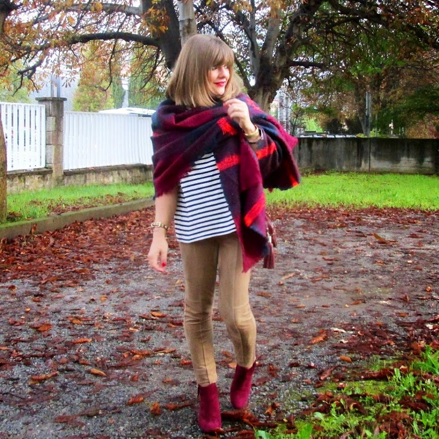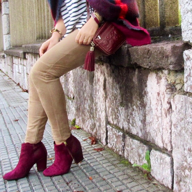 El look es muy sencillo. Combiné una camiseta navy con leggins de antelina, botines y bolso granate. Es una combinación de tonos que me encanta, adoro el famoso "burgundy" para el otoño.