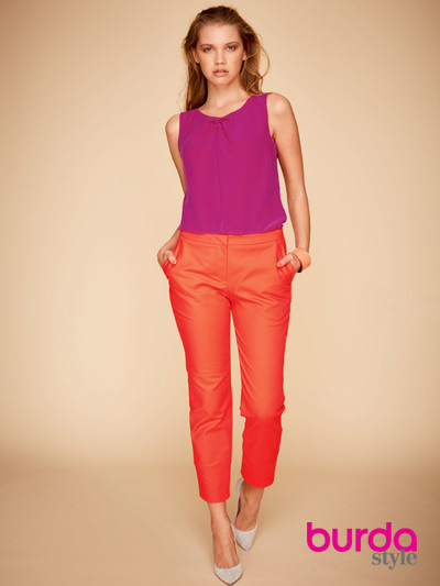 Y no falta el pantalón pitillo tobillero , en tono rojo coral