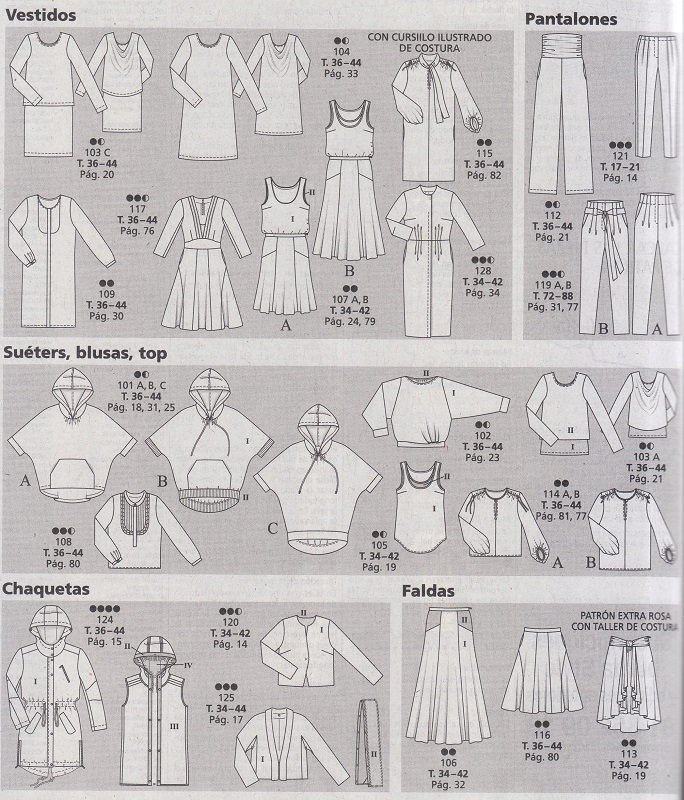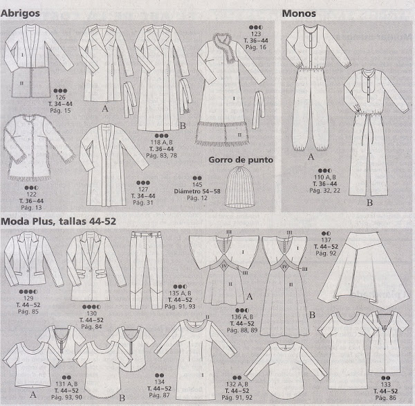 En los dibujos esquemáticos podéis ver mejor los modelos y patrones , las tallas de cada uno ,