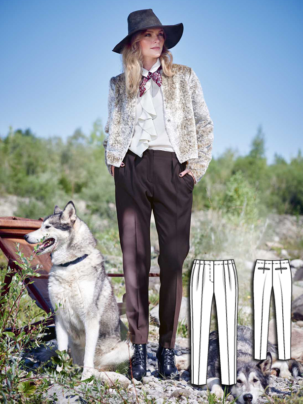Este modelito de chaqueta cuadrada y pantalón estrecho con raya y pinzas , viene en tallas cortas