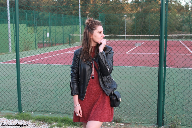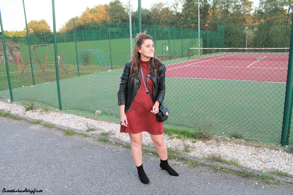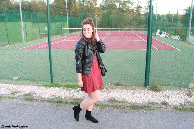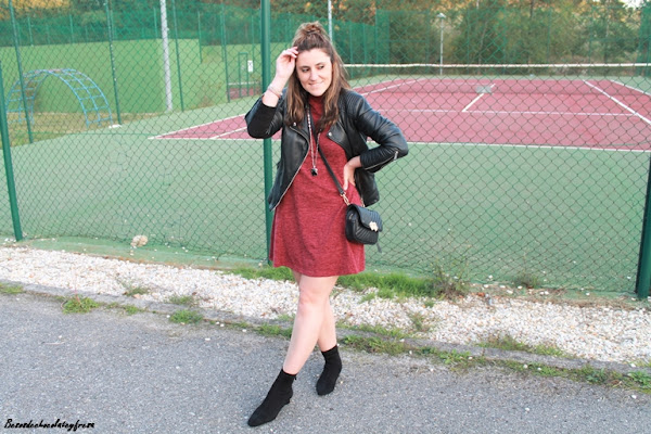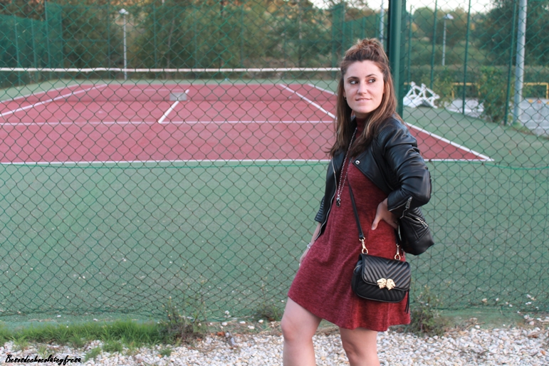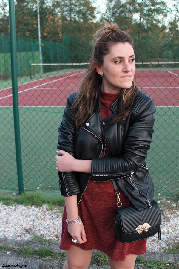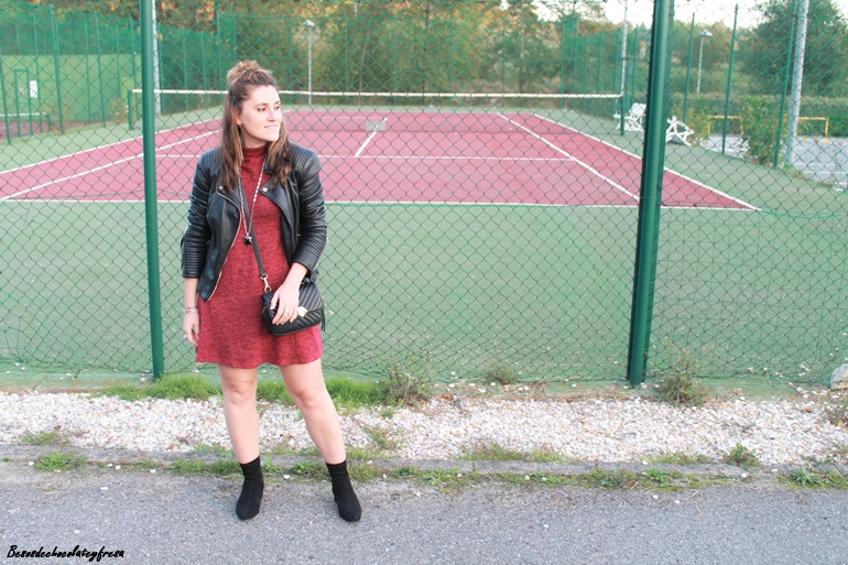En este caso combino este tipo de botines con detalle de cremallera en dorado junto con el tacón del mismo color metálico junto con un vestido cómodo y fluido de punto elástico en color burdeos. Completo el look con biker en negro y bolso en el mismo color.