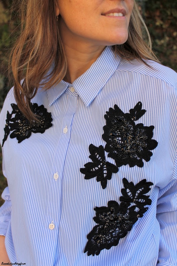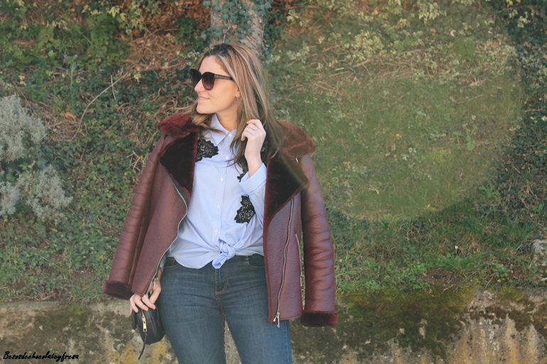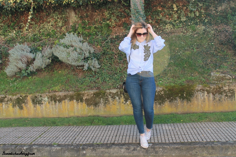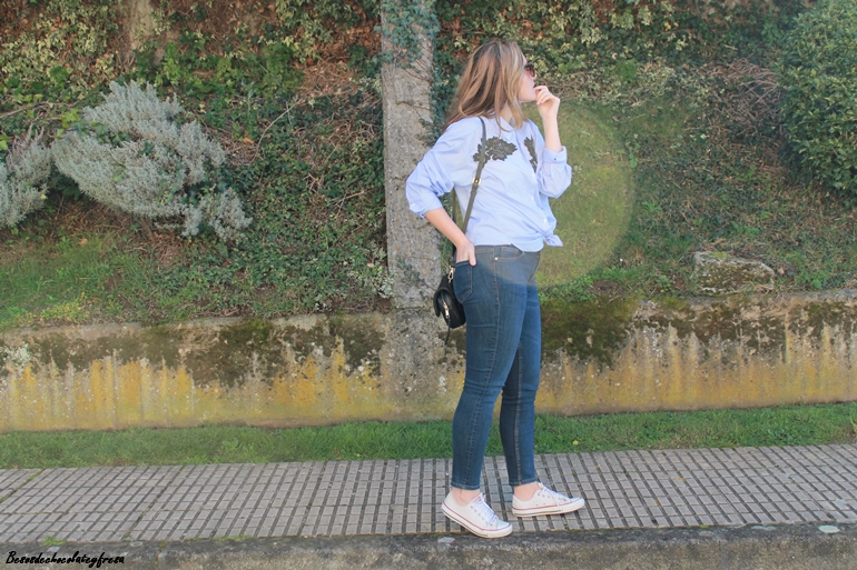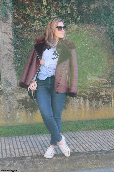 En esta ocasión me decanté por una camisa oversize con bordados en negro, junto con jeans oscuros y converse, bolso a juego con los bordado y como nota de color la cazadora de aviador en burdeos.