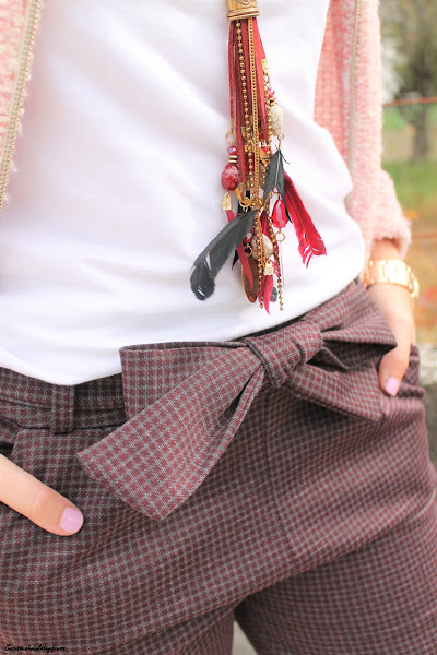 Esta vez os enseño los nuevos pantalones que han entrado en mi armario, se trata de unos en color burdeos con estampado a cuadros y detalle de cinturón con lazada. Bolsillos laterales y elásticos, además decidí remangarlos en el bajo porque tienen el interior en negro y me pareció que quedaba bien el contraste en el pantalón.
