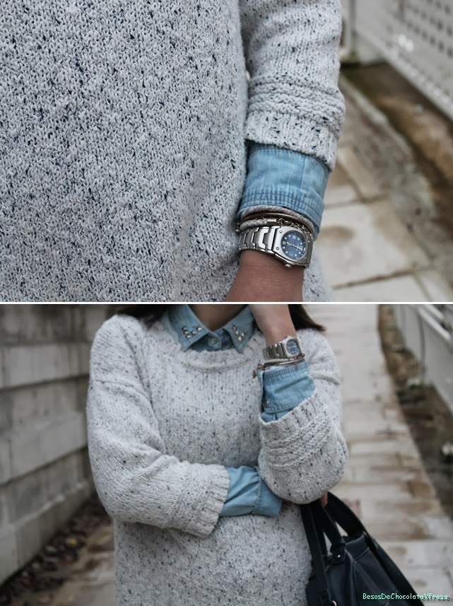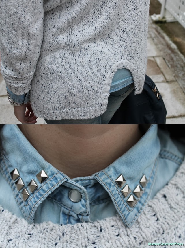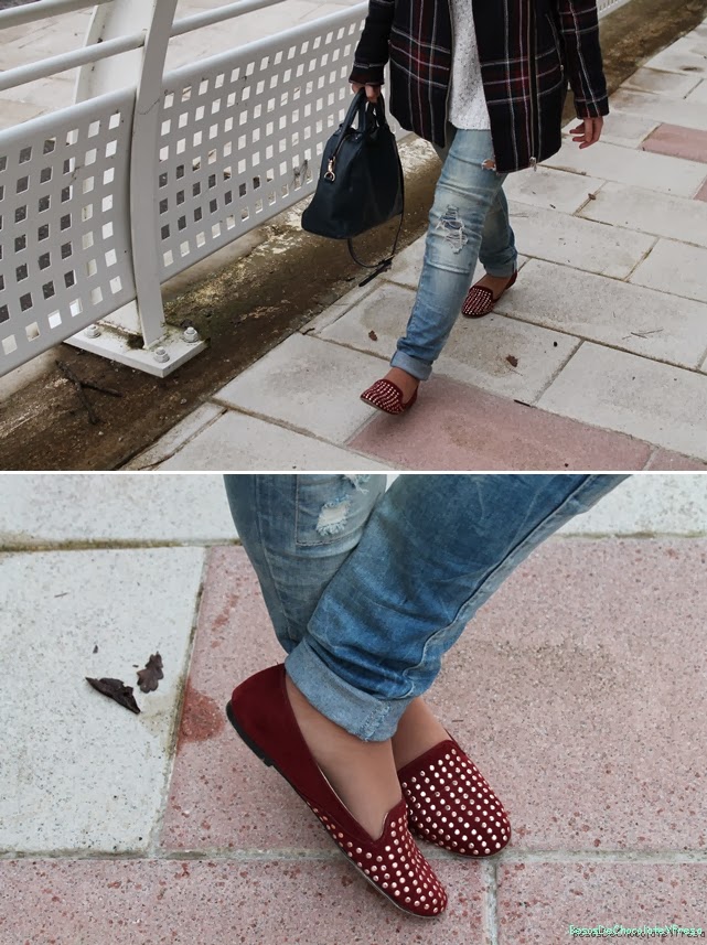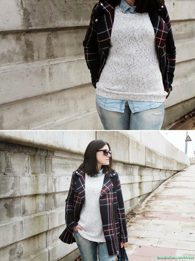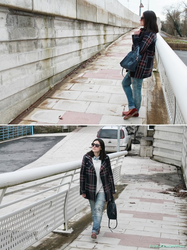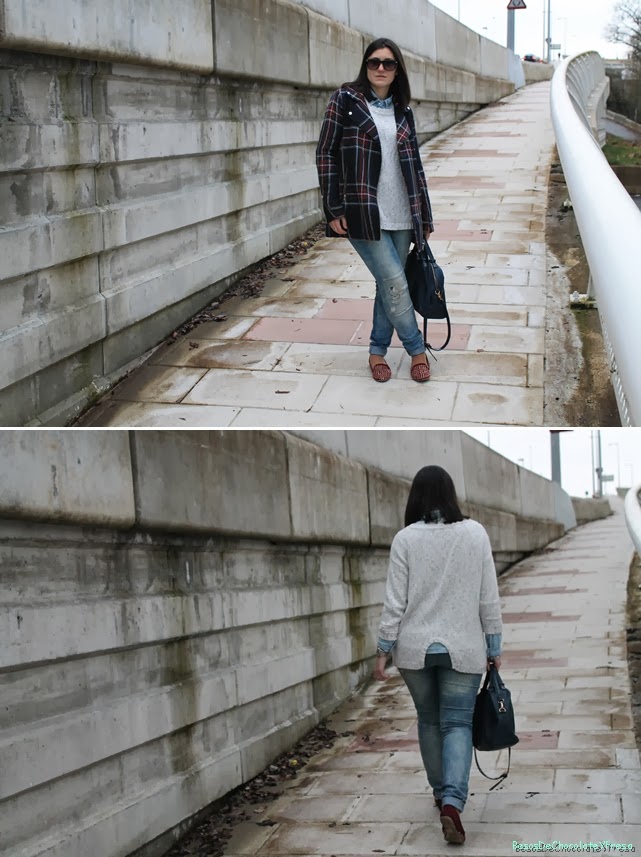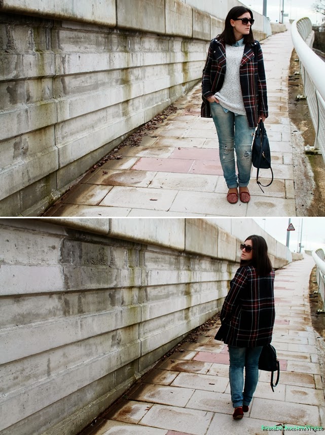 Today I"m wearing a look with known another way of combining tartan coat. This time I combined with blue tones like heather sweater, denim shirt and ripped jeans. As supplements slippers in burgundy and navy blue shoulder bag.