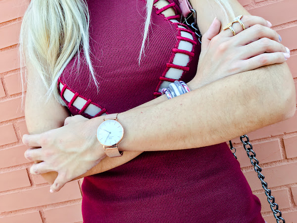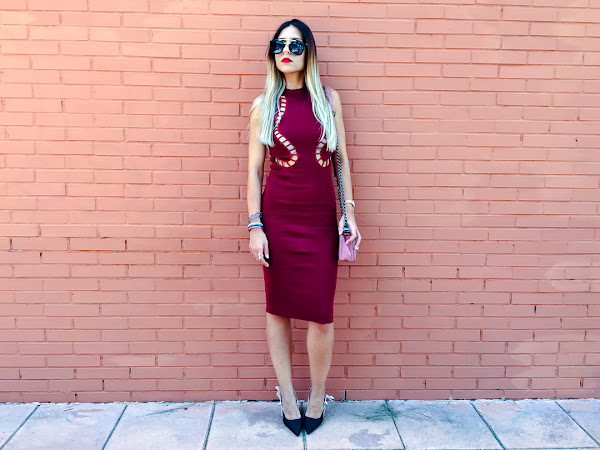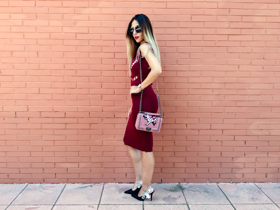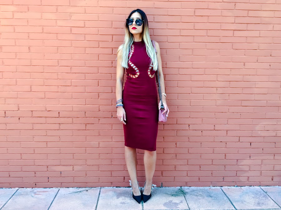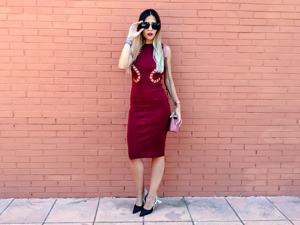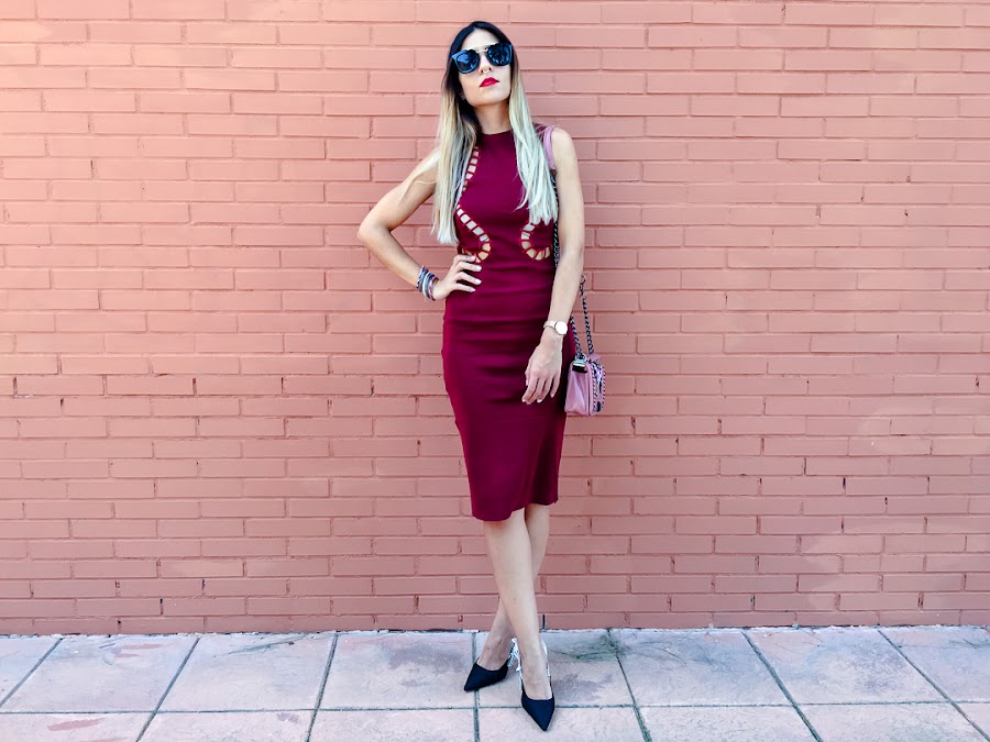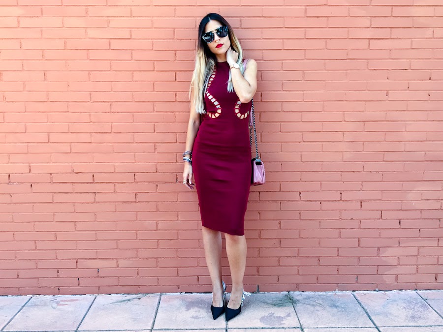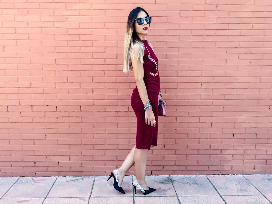 Es burdeos, de corte midi súper ceñidito, lo que hace que sienta como un guante y tiene un detalle súper original en el escote.