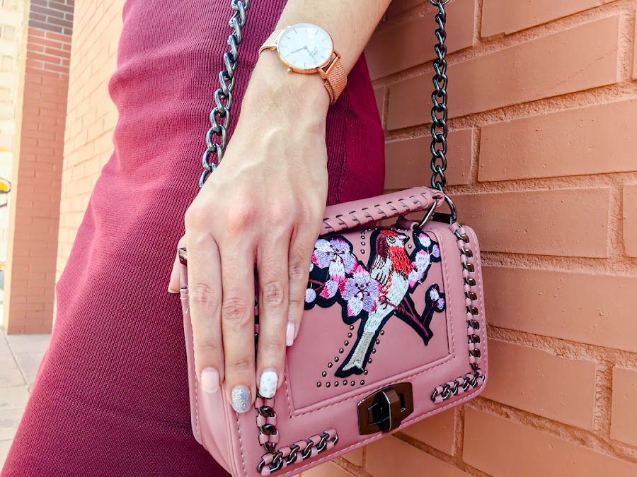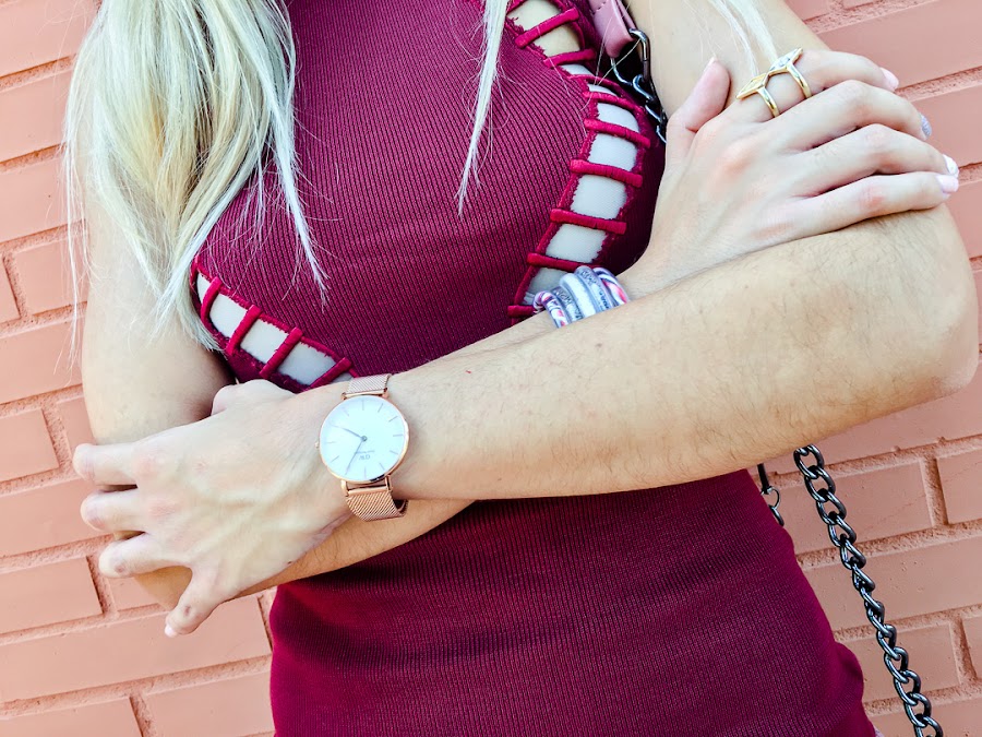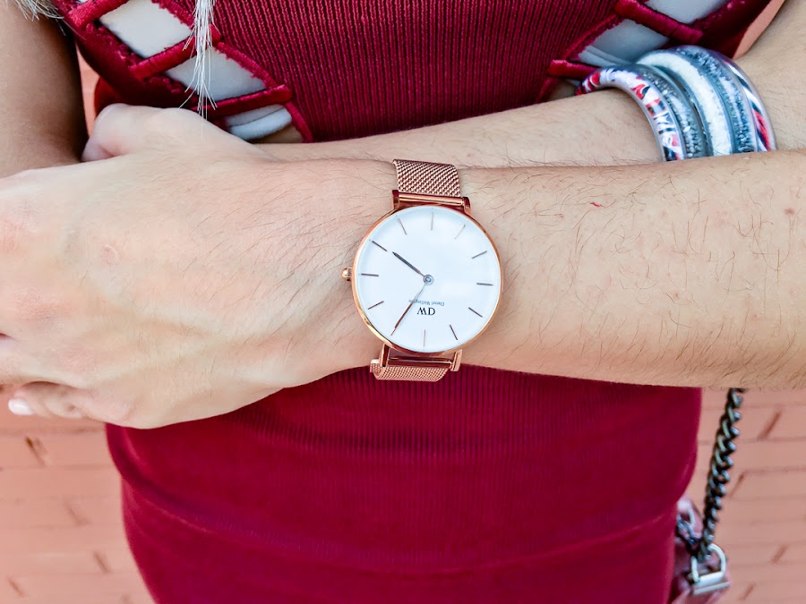 It is burgundy, cut midi cut, which makes it feel like a glove and has a super original detail at the neckline.