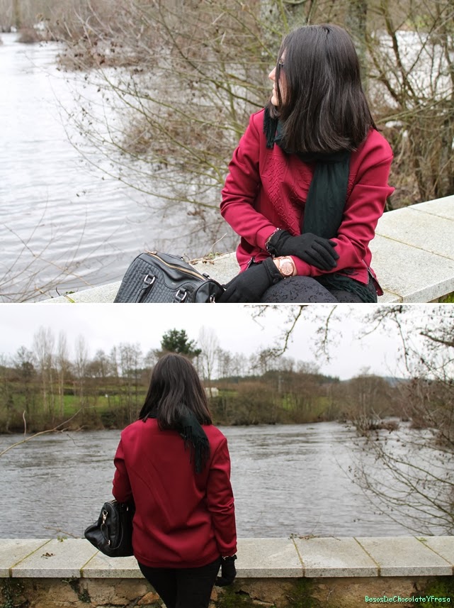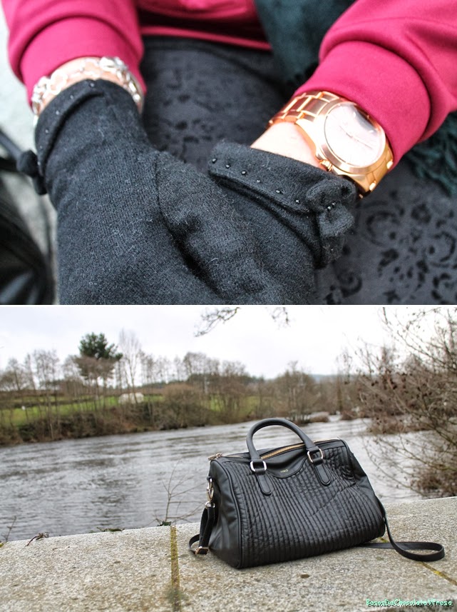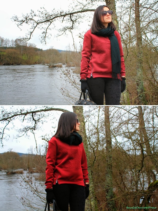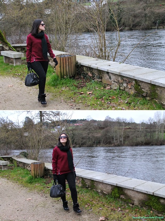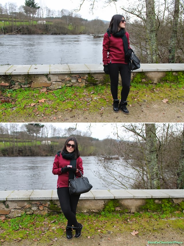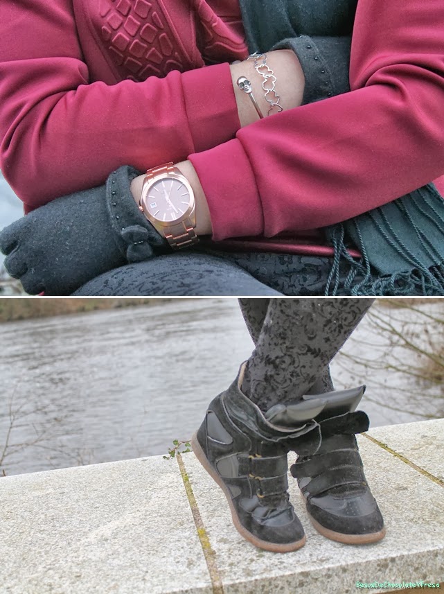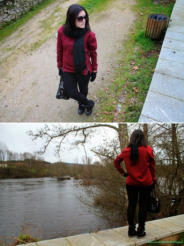 Today I"m a look in burgundy and black tones, which I combined, burgundy pullover neoprene trend with leggings brocade and accessories in black as sneakers, tote bag, gloves, scarf and sunglasses except clock coppery color.