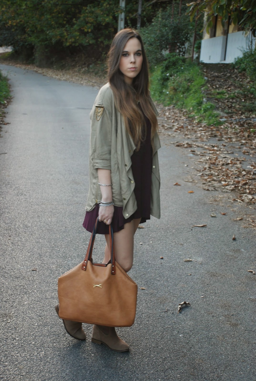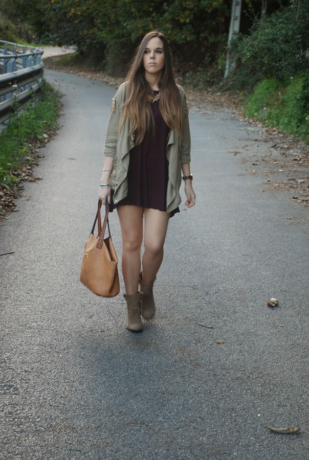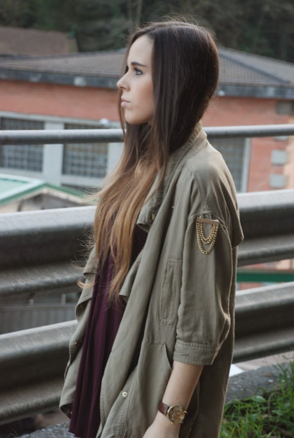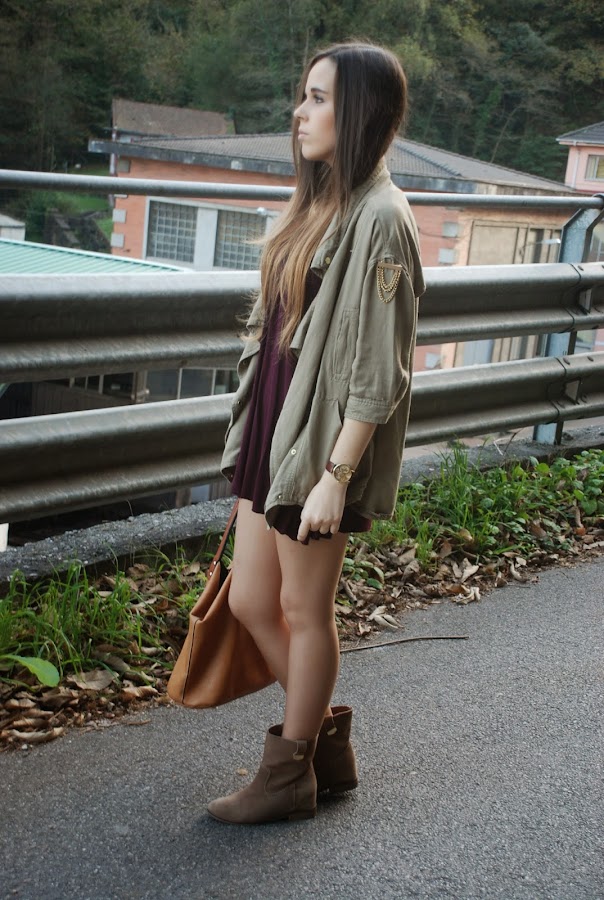 Esta vez lo combiné con chaqueta militar (ya sabéis lo que me gustan a mi estas chaquetas) y botines marrones. Como complementos maxi bolso, collar dorado y reloj.