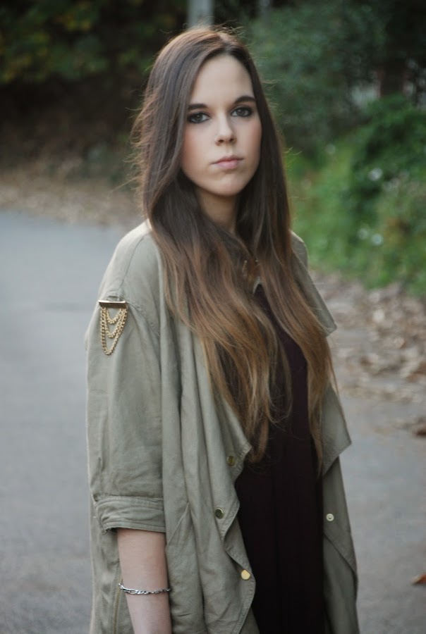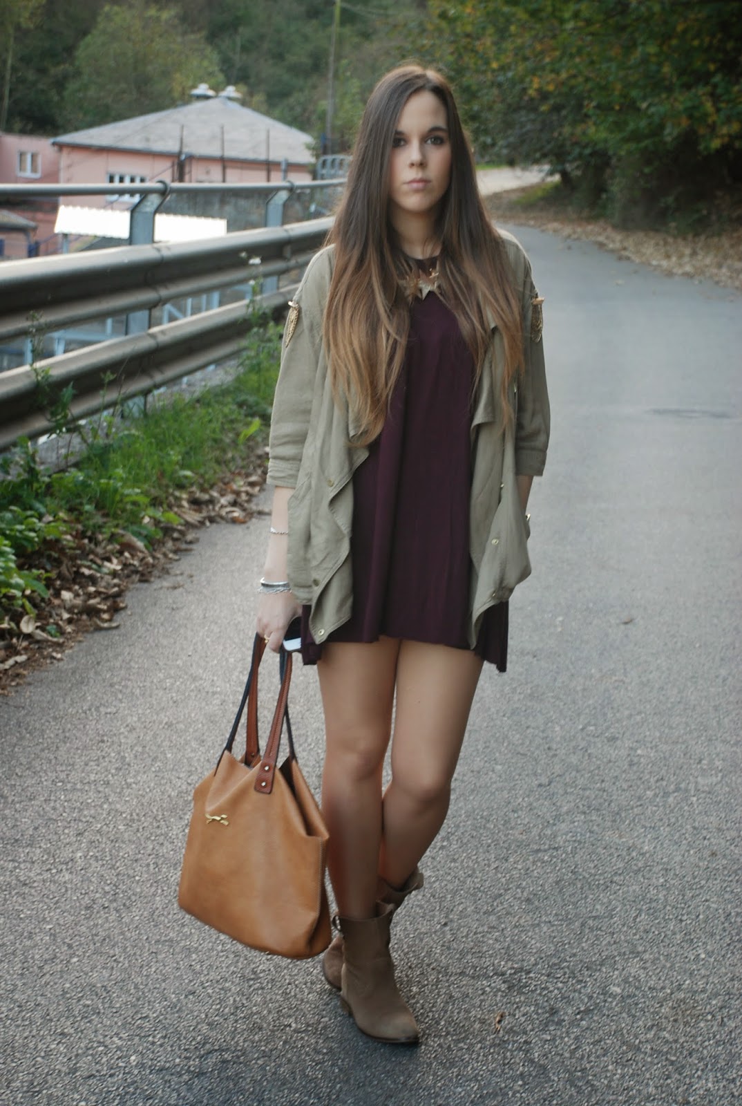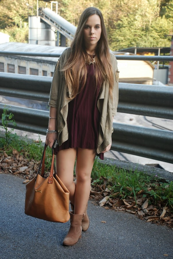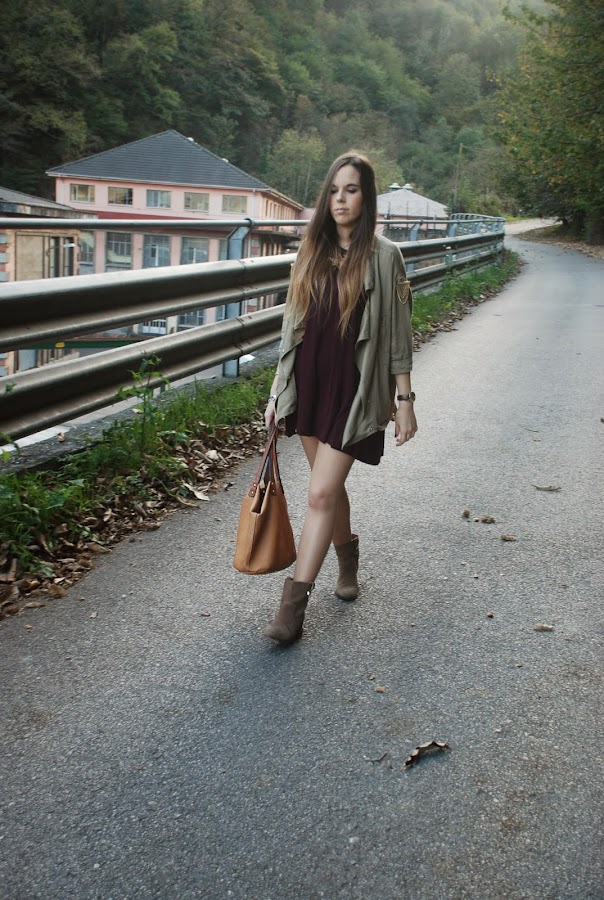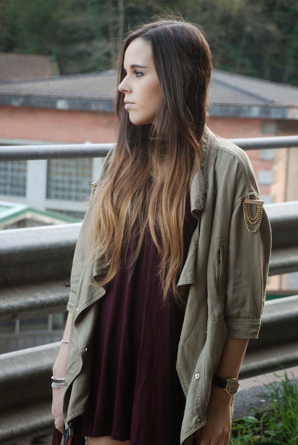 Esta vez lo combiné con chaqueta militar (ya sabéis lo que me gustan a mi estas chaquetas) y botines marrones. Como complementos maxi bolso, collar dorado y reloj.
