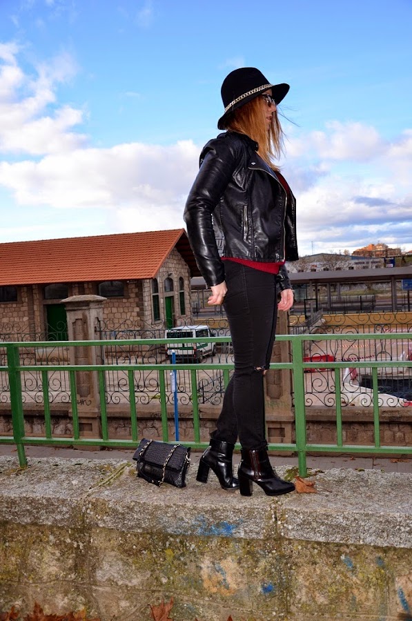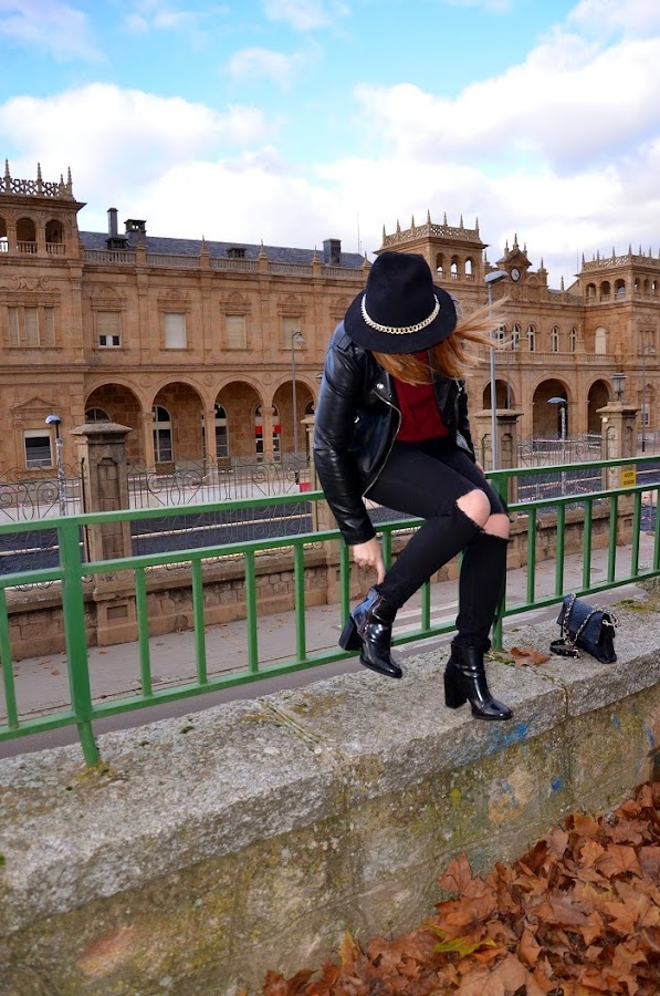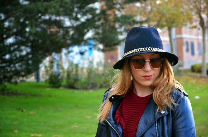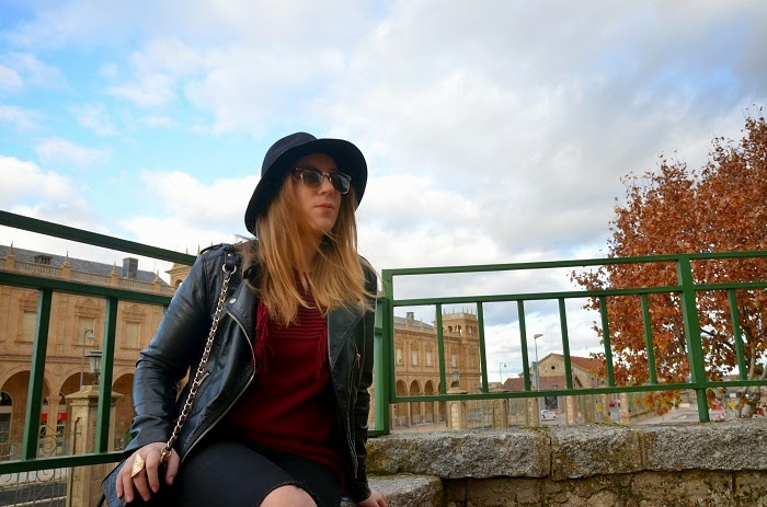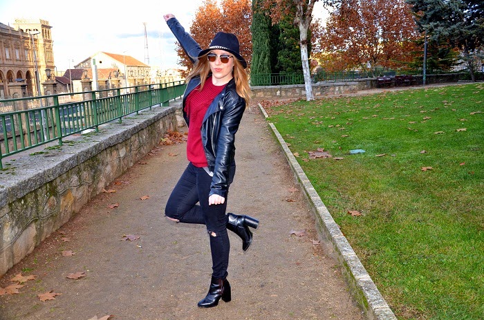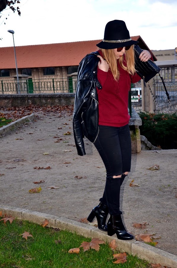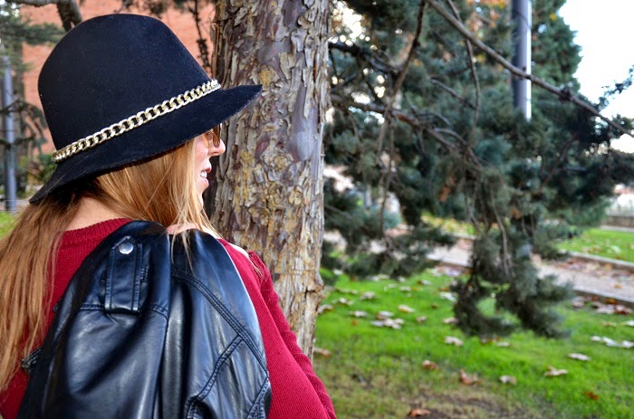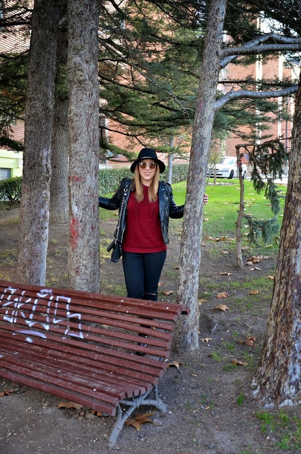 Boniitos ¡Feliz año! ...Espero estéis pasando unas muy buenas fiestas navideñas con los vuestros y todo eso, yo, pese a que no me gustan mucho estas fiestas y que no paro de trabajar tampoco me estoy enterando mucho... Como veis no tengo apenas tiempo para hacerme fotos, editarlas y subirlas, asi que estoy aquí tirando de día festivo para ponerme un poco al día y enseñaros un look que lleve hace unos días para una comida familiar y tarde de amigas, fue uno de esos días que la niebla dió tregua y pudimos disfrutar de un ratito de sol y al ser mmediodíapude aprovechar a dejar el abrigo en el coche... Si algo bueno tiene el invierno es que lo tenemos muy fácil a la hora de vestirse e ir monisimas y calentitas, soy muy fan de los jerseys y más si son rollo oversize que van genial con todo:pitillos, shorts, faldas... En este look un poco gamberrete destaca mi jersey bonito de flecos en color burdeos,[el color por excelencia de la temporada y que vendrá pisando aun más fuerte de cara a la primavera (ya sabéis...fichar prendas en rebajas)...] ¿el resto? prendas atemporales en negro y un sombrero que rescaté del armario ;) Espero os guste y que sigáis disfrutando del ambiente festivo los que podáis y los que no... también :) Un besito y que el 2015 os traiga mucha salud y mucho amor!!!
