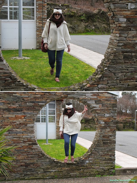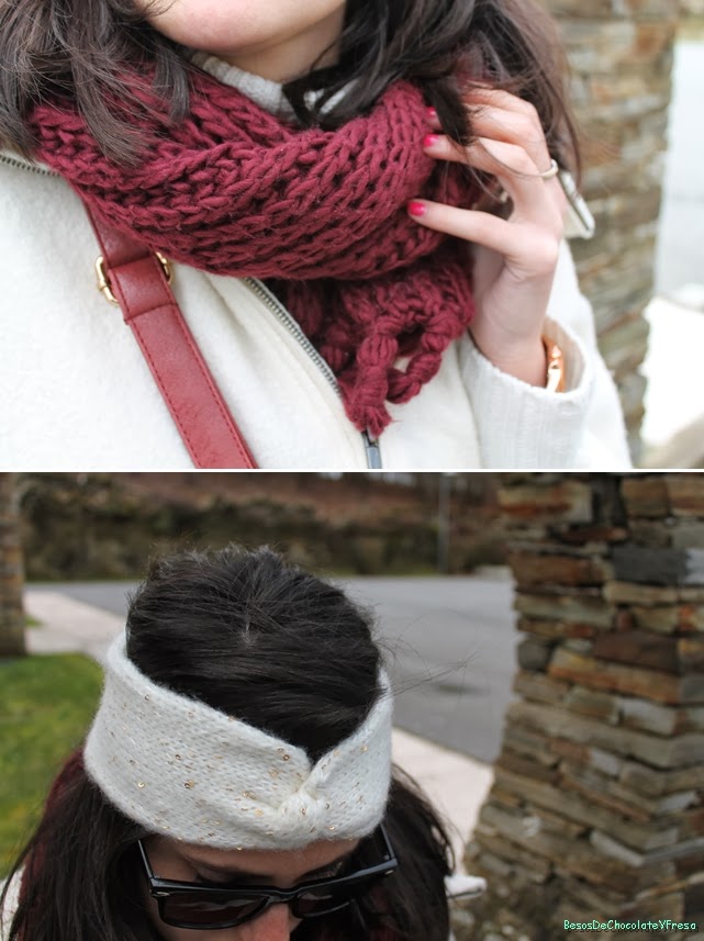 Esta vez opté por llevar sweater de ochos blanco, jeans básicos y slippers burgundy con tachuelas. Como complementos, bandana con brillos dorados en color blanco y bufanda de lana en el mismo color que el bolso y las slippers.