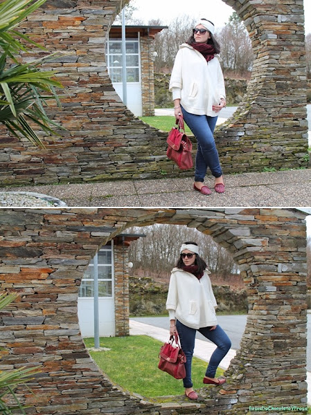 Una nueva forma de combinar el poncho de color blanco es con este bolso en color burgundy que me llego la semana pasada gracias a la web de ropa y complementos Mentha Shop. Tiene cosas super bonitas y a muy buen precio, que os recomiendo. Prueba de ello es este bolso bandolera en piel combinado con ante muy útil y fácil de combinar.