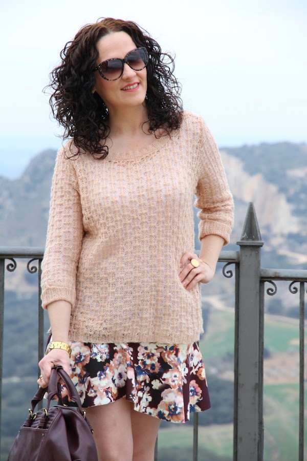 La chaqueta de polipiel que llevo hoy la miré en temporada pero entre que la veía muy fina para el invierno y el precio que tenía no me la compré. Durante el remate final de las rebajas me topé con ella de nuevo, estaba en mi talla y además a un precio más que bueno por lo que me la quedé. Ahora en primavera le voy a dar mucho uso, ya me la puedo imaginar en looks boho chic de los que ya sabéis que soy muy fan. Como no he podido esperar a estrenarla, estos días que refresca un poco me la he puesto con outfits un poco más abrigados como este que lo llevé un día de trabajo, opté por ponérmela con un jersey fino de punto en nude y falda de flores en tonos burdeos, azules y nude.