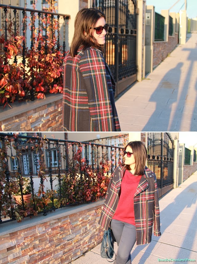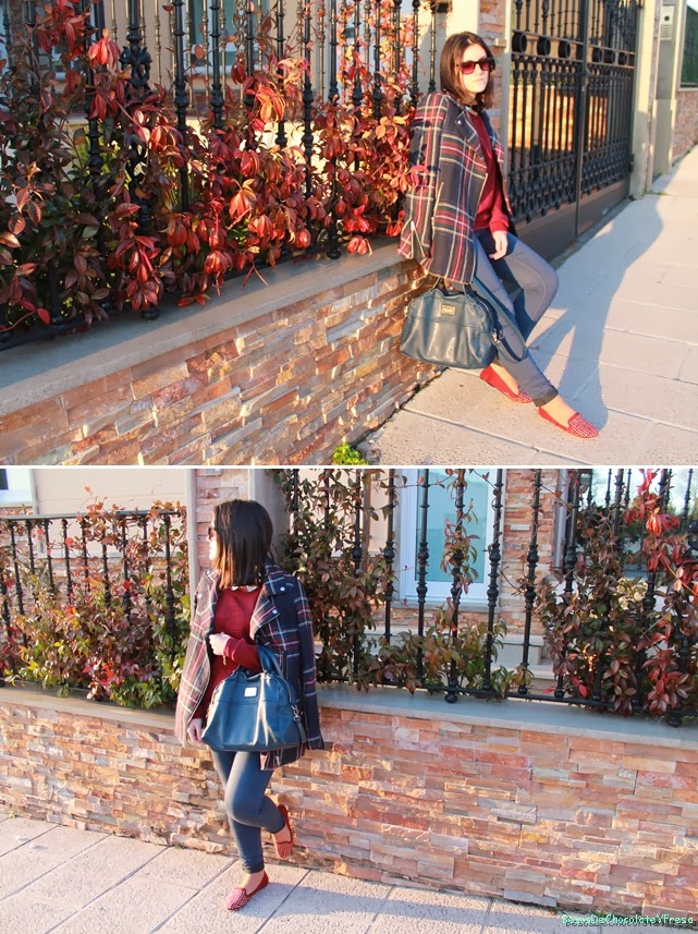 La combiné con tonos azules como el bolso bandolera y el abrigo tartan con azul y burgundy y slippers de tachuelas en el mismo tono que la sudadera.