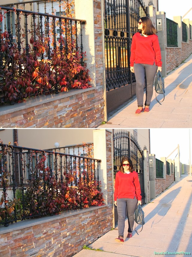 The combined it with shades like blue shoulder bag and coat with blue and burgundy tartan slippers and tacked in the same tone as the sweatshirt.