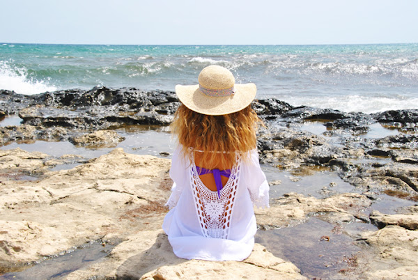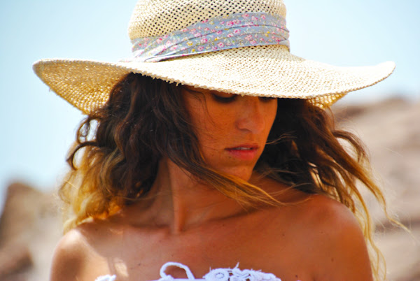 Completan el look playero mi nuevo bikini con bandeau lila y brasileña blanca con tiras laterales supersexys, que combinan a la perfección con la pamela de rafia.