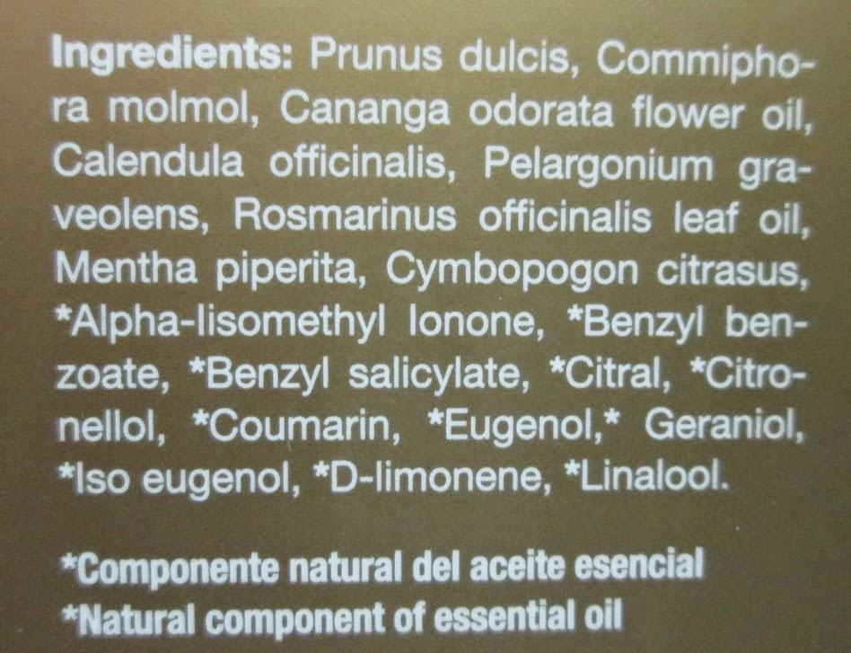 Es un aceite, que se presenta en una botella de cristal marrón, preciosa, y que trae 150 ml de cantidad. Tiene una textura muy ligera, por lo que se absorbe muy muy bien. Pero lo que más me ha gustado de él, ha sido su aroma, es un olor suave pero muy muy agradable, y un tanto floral, ya que es rico en aceite esencial de geranio, aceite vegetal de almendras, germen de trigo, caléndula, aceite esencial de romero, mirra, incienso, ylang-ylang, y lemongrass.