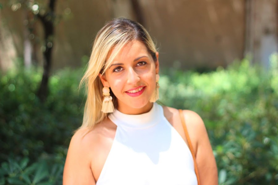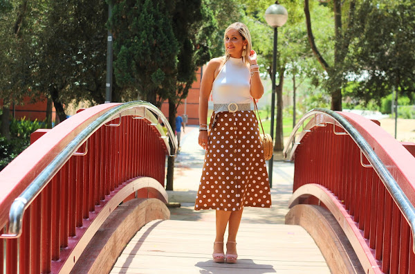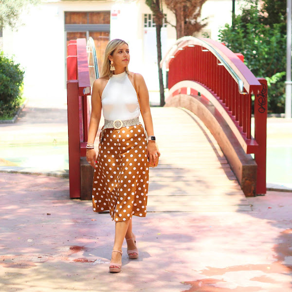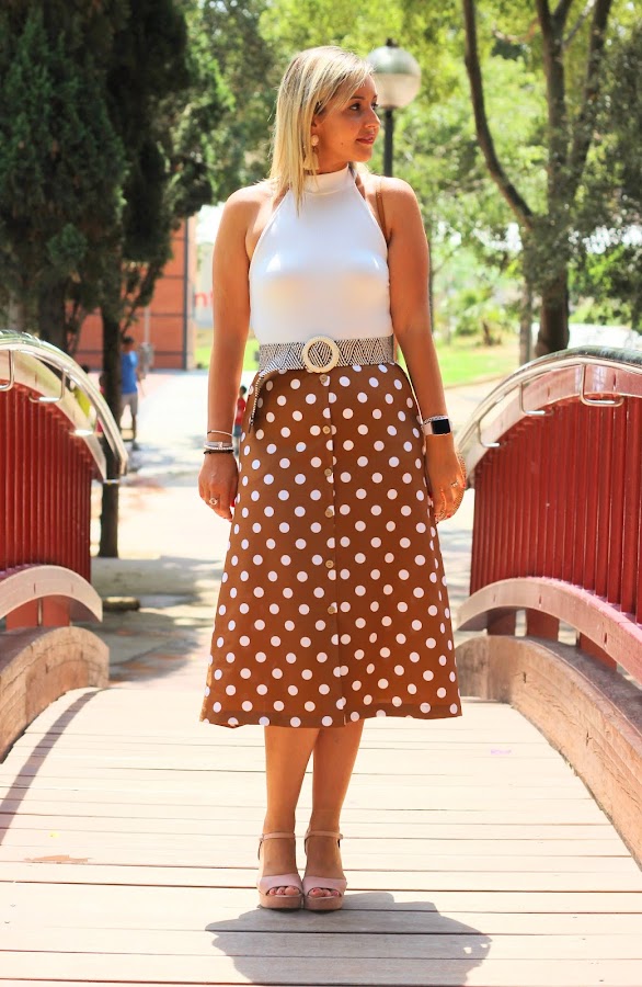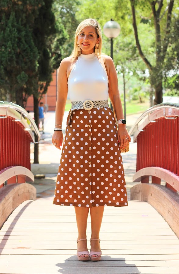 Hoy os traigo el último look de esta temporada. En el look de hoy llevo mi nueva falda de topos con botones que llevaba buscando desde inicios de la temporada y que por fin encontré en la web de Zaful. Lo combiné con un body blanco de cuello halter y mi nuevo cinturón de Stradivarius. Los accesorios que escogí fueron mis sandalias nude y un bolso redondo de rafia que compré en mi viaje a Bali.