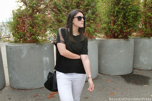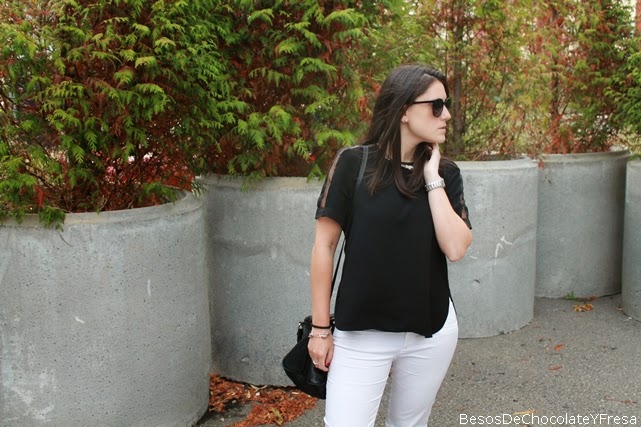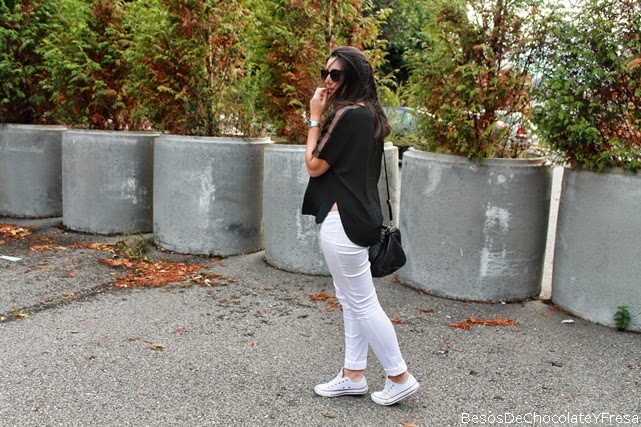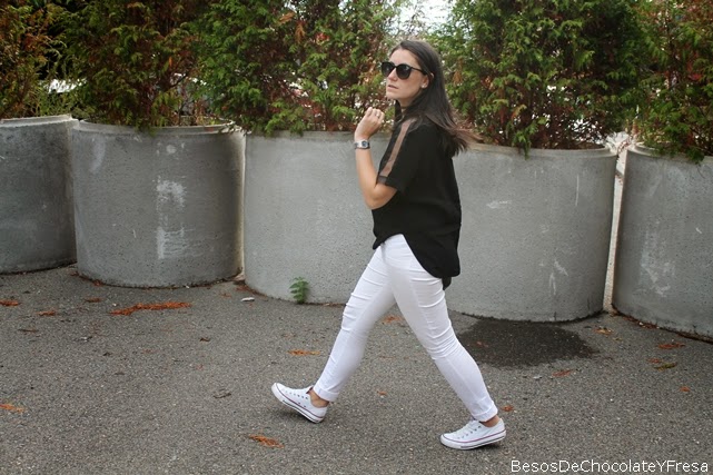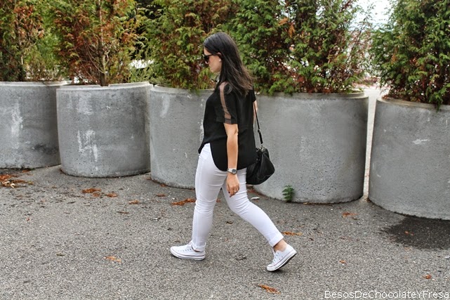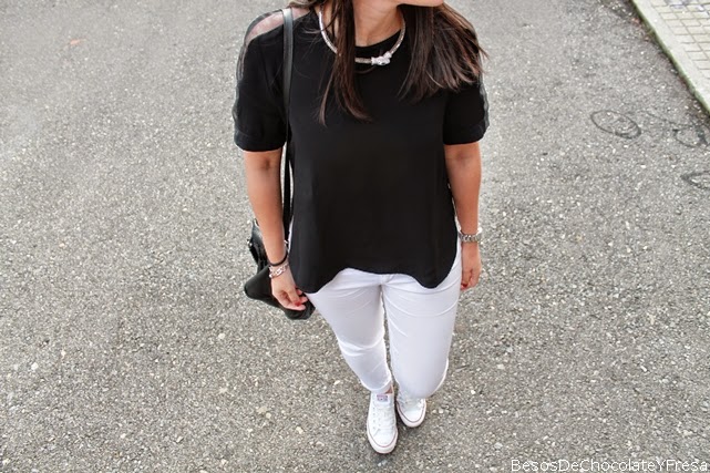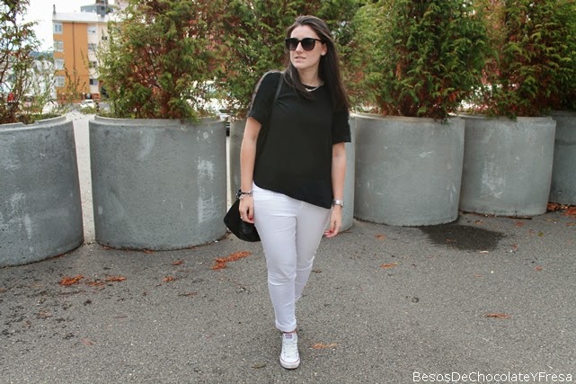 Hoy llevo un look compuesto por tonos blancos y negros, pantalones blancos con camiseta negra, asimétrica y con transparencias e hombros y mangas, converse, bolso negro y complementos en plateado como el reloj y el collar de serpiente.