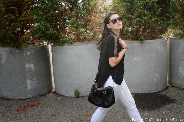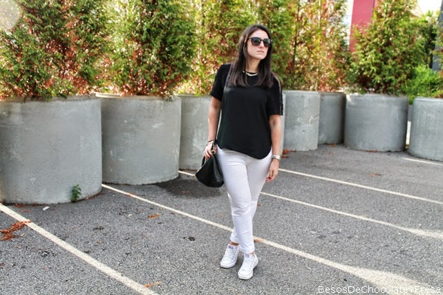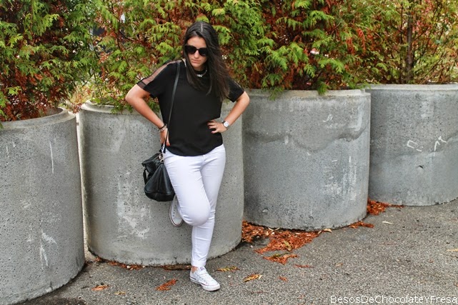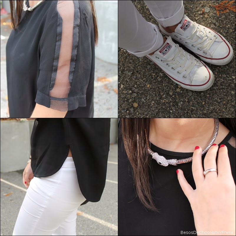 Today took a look consisting of white and black tones, white pants with shirt black, asymmetrical and transparencies and shoulders and sleeves, converse, black bag and accessories in silver as the clock and snake necklace.