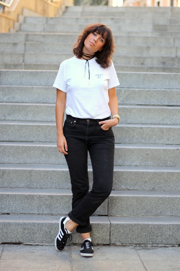 Por supuesto añadiendo toques que marquen la diferencia, cómo són claramente tres detalles...la gargantilla (más conocida en el lenguaje modil como "choker") finita con terminaciones doradas, las gazelle que sustituirán a las Stan Smith poco a poco, y Levis! un buen jeans Levis vintage que tan cansados estaréis de verme y de decir...