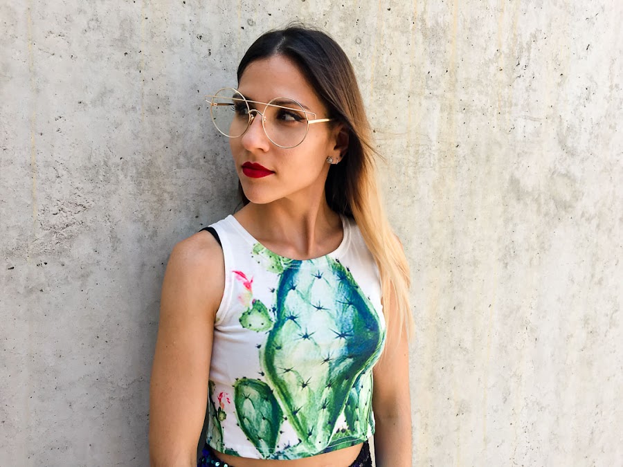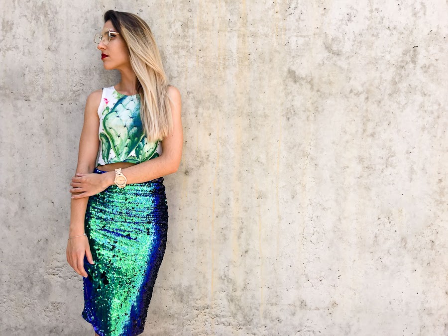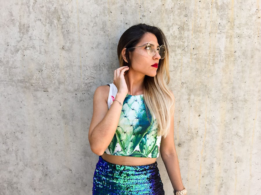 Pero aquí vengo como cada viernes con un nuevo post y uno nuevo look! De nuevo repetimos tendencia y vuelvo a usar lentejuelas y mucho brillo en mi outfit con esta falda midi. En realidad es de color verde, pero según la luz a veces se ven tonos azules o lilas. La he combinado con un crop top estampado de cactus, porque los cactus en verano siempre molan!!