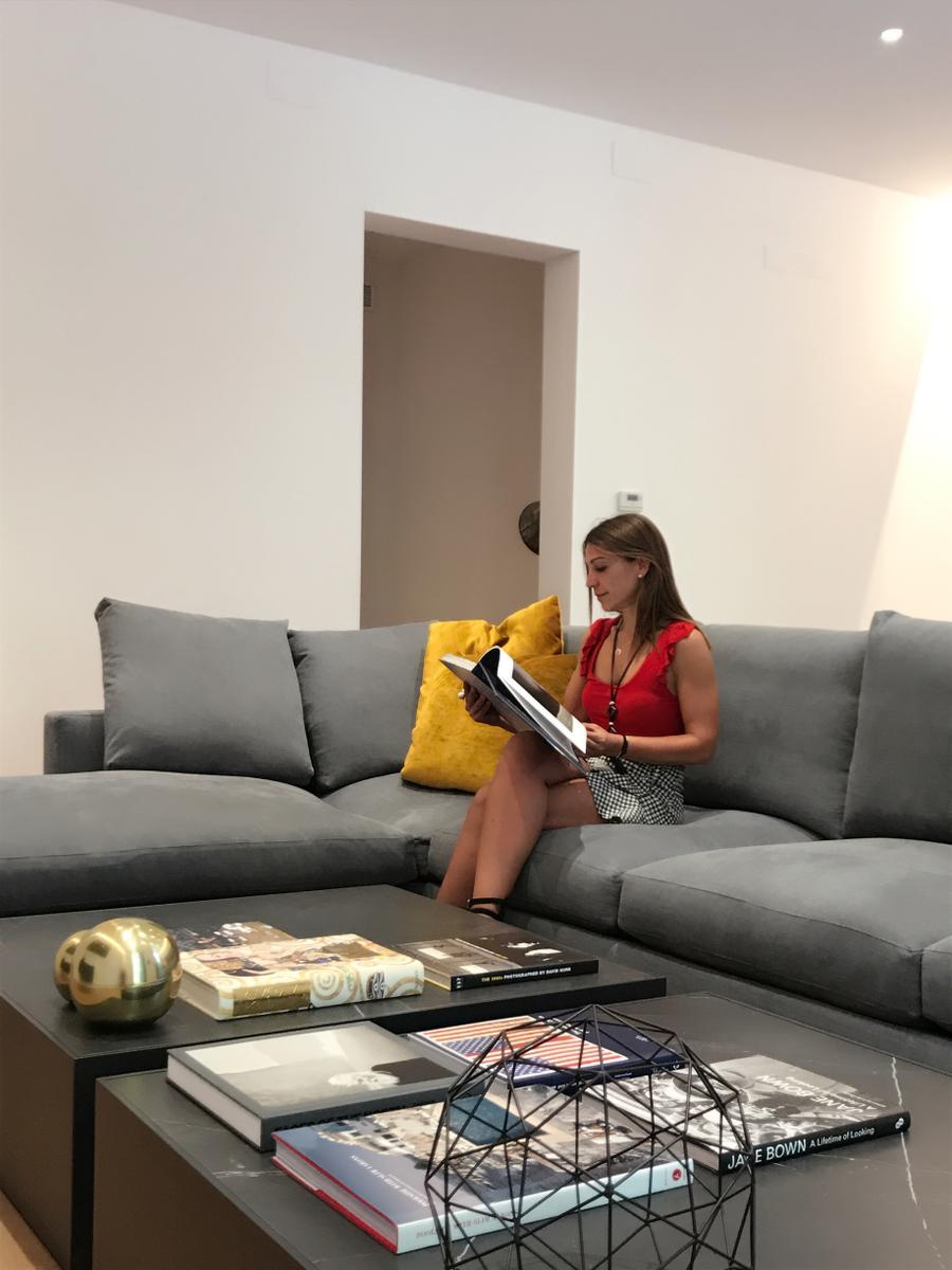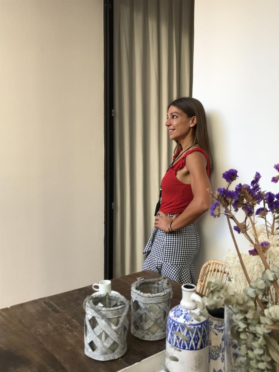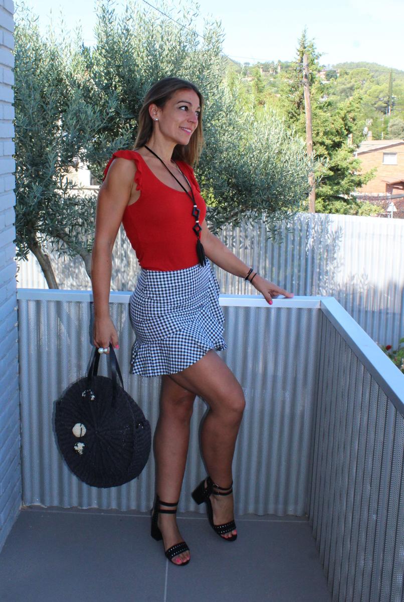 El outfit está formado por minifalda de volantes con cuadro vichy, indispensable estos meses y los que se avecinan, combinado con camiseta en color roja, adonada con unos minivolantes fluidos en la zona de los hombros, que aportan la gracia a una camiseta básica. A los pies sandalias negras de tacón medio y ancho, perfecto para una jornada maratoniana, adornadas con mini tachuelas, que por cierto, vuelven a asomar la cabecita para este otoño invierno. Bolso de rafia redondo en color negro, que ahora que la mitad del verano ya ha pasado, puedo declararlo como el hit de esta temporada, los hemos visto grandes, pequeños, en color claro, en oscuros, con adornos….. infinidad de formas y maneras, pero con la pecualiaridad de ser redondo y con un material tan veraniego como es el mimbre ( o rafia).