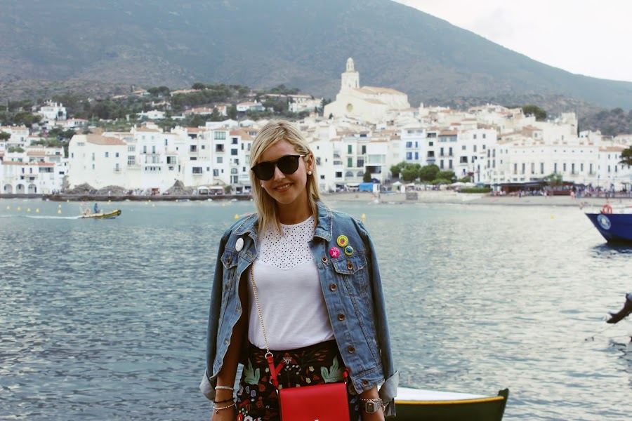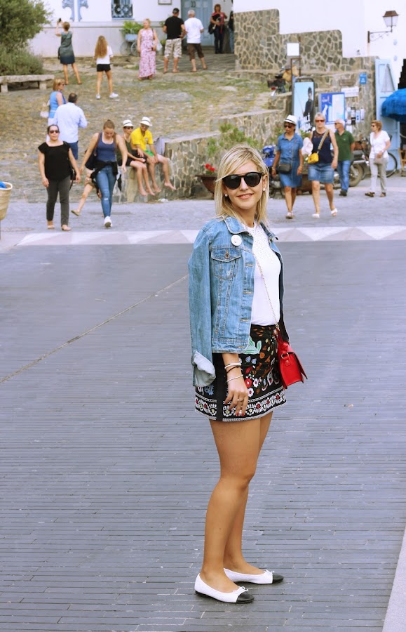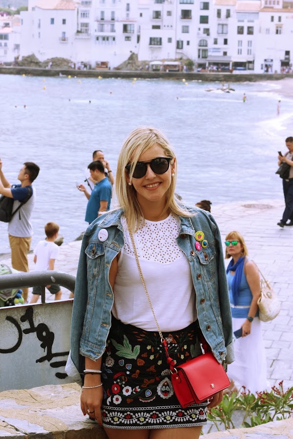 Para esta pequeña escapa, elegí un look casual chic con mi faldita de bordados y una camiseta blanca con volantes y bordados. Como en esa zona de Girona siempre suele hacer aire, me puse una cazadora tejana para combatir el viento. El resto de accesorios fueron mi bolsito de color rojo y mis manoletinas.
