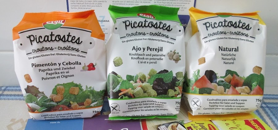 - Picatostes "Esgir": Me hizo mucha ilusión encontrarme con tres bolsitas, jejeje. Aunque más bien, las naturales fueron para mí, y las otras dos para mi marido, jejeje. Están realizados sin gluten y yo las uso mucho para añadir en las ensaladas, pero también la podéis utilizar en gazpachos, sopas o cremas. Hay tres sabores diferentes y cada una tiene un precio de 1€.