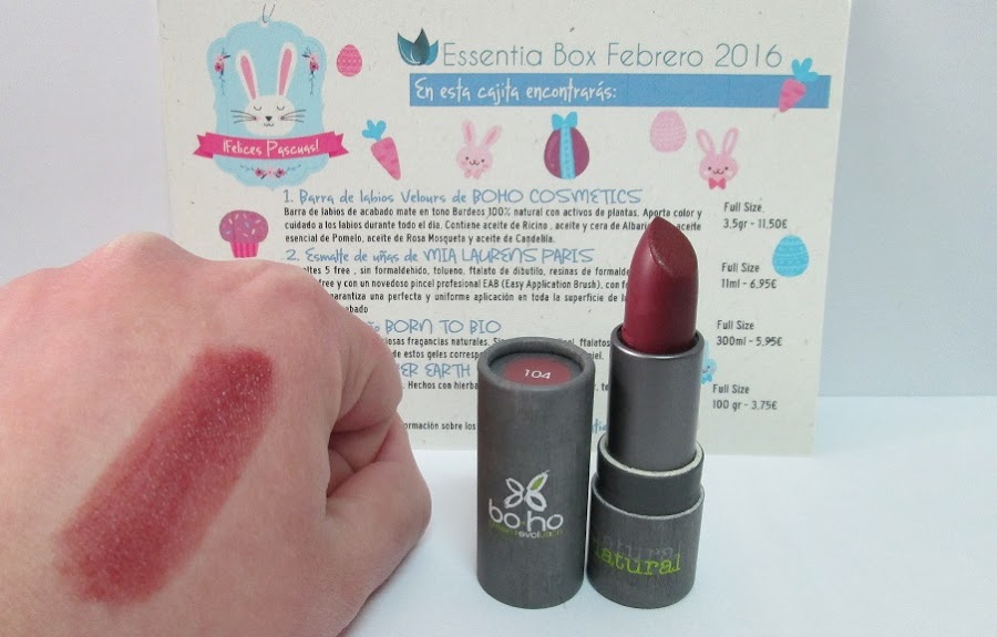 Yo tengo el tono "104 Velours", es decir, un burdeos precioso y expectacular. Deja un acabado, casi mate, y es bastante cremosito..., aunque no en exceso. Es por ello, que no me ha desagradado tanto (como el tono del esmalte de uñas, por ejemplo), ya que como es modulable..., lo puedo utilizar con una o dos pasadas (como mucho), perfectamente, jejeje. Con esto quiero decir, que si das una o dos pasadas, aporta un sutil y suave color en los labios (muy parecido a los bálsamos con color) y si aplicas más, poco a poco, se intensifica y queda más cubriente y/o pigmentado.