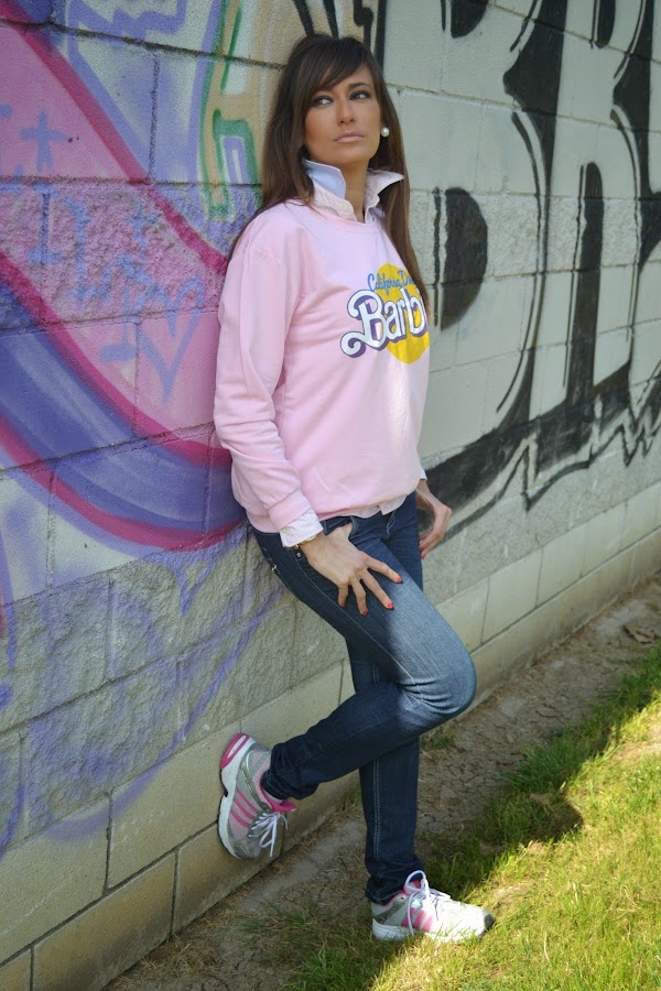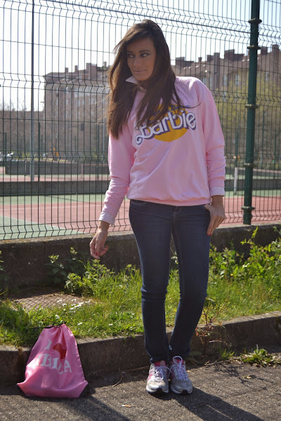 Elegí esta versión de la mítica sudadera de algodón de Barbie, en color rosa chicle y cuello en forma de O, muy similar a las que, por ejemplo, triunfaban en los 80, porque además de parecerme muy cómoda y juvenil para mis looks más urbanos en el día a día, no sólo por el tejido tan amoroso, sino porque además apenas hace falta plancharla, estaba rebajada y en caso de extravío del artículo por el camino (no ha ocurrido así, pero siempre se asume un riesgo), la pérdida económica no hubiese sido tan grande.