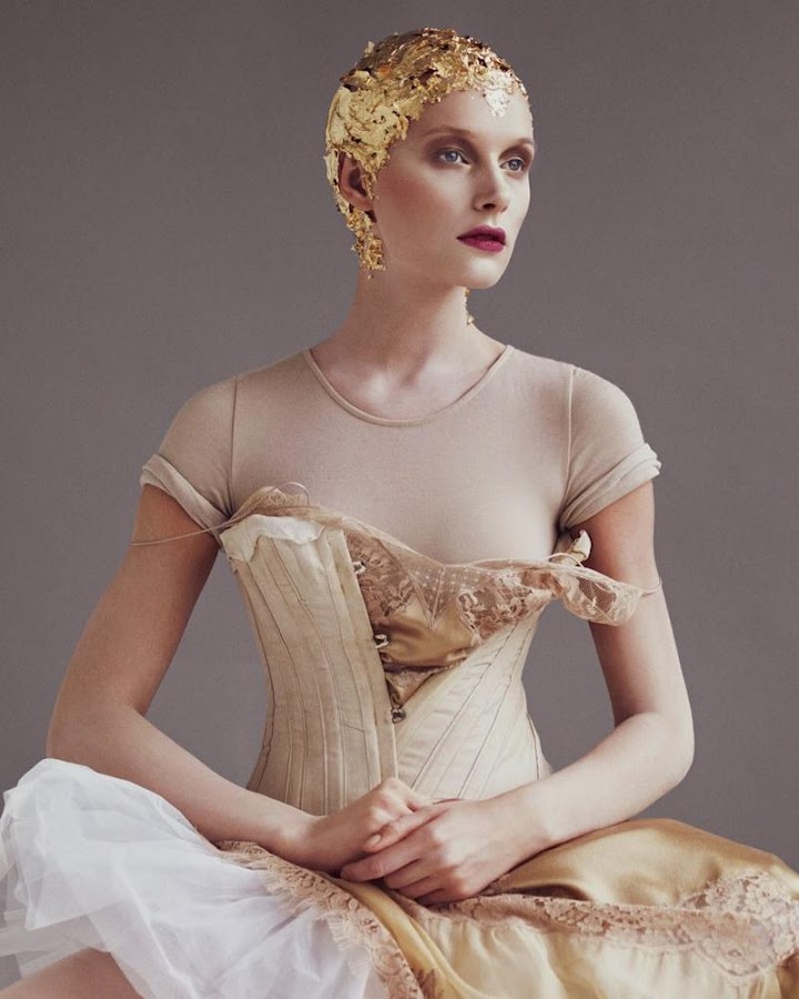Vasilisa lleva bolero seda Vivienne Westwood Couture, vestido de tul Lanvin con la cinta del grosgrain, zapatillas de ballet de cuero Bloch, casco, del propio estilista