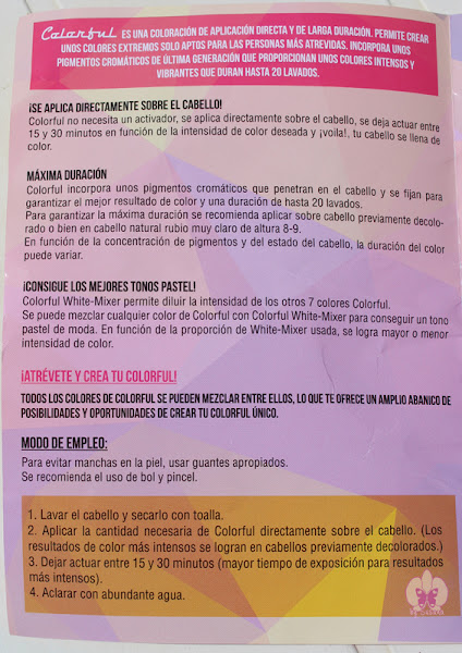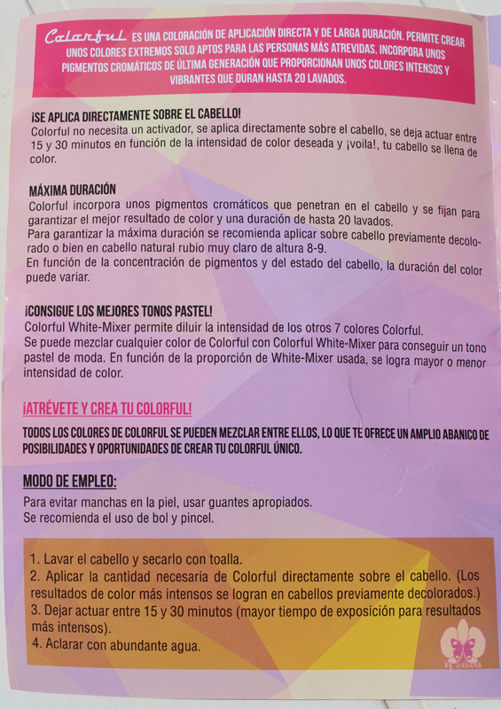 Aquí veis su aplicación y sus recomendaciones, porque obviamente en un tono oscuro sin decolorar, no va a coger nada de color, sólo en cabellos naturales súper rubios o en cabello previamente decolorado. El envase lleva dosificador y es muy cómodo de aplicar. Hay que usar guantes para no mancharnos las manos y dejarlo de 15-30 minutos según la intensidad que queramos conseguir.