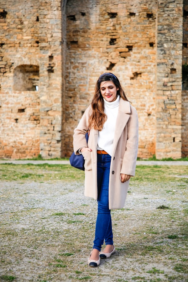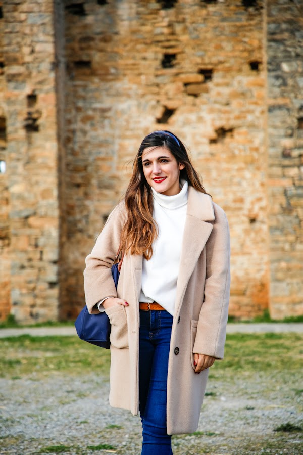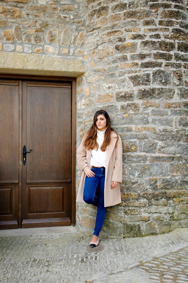 El camel es un color que combina casi con todo, pero a mí me encanta con prendas blancas, beige, blush, azul marinas y negras. En el look que os traigo hoy llevo un jersey blanco roto de cuello alto, unos clásicos jeans, unas manoletinas bicolor de punta y un bolso Longchamp en azul marino. Mi intención era ponerme algo cómodo, que me permitiera pasear por el pueblo sin problemas, con lo que no pasase ni frío ni calor y que a la vez fuera femenino y estiloso.