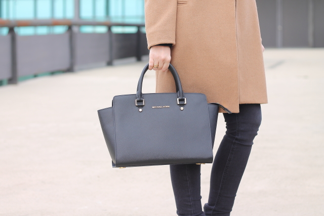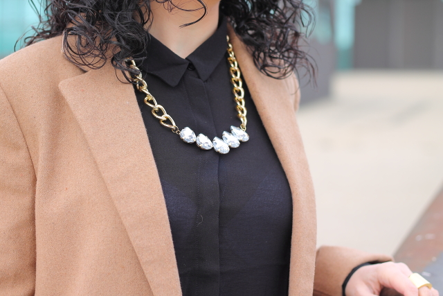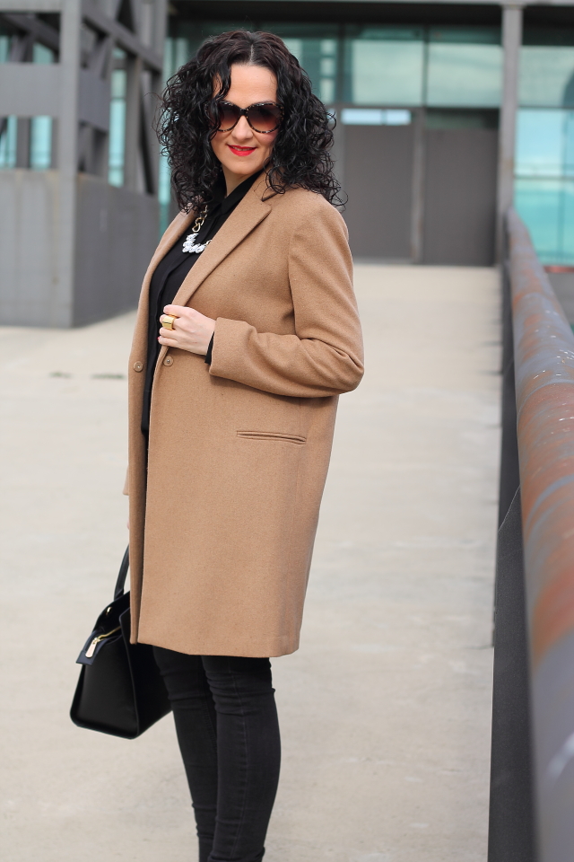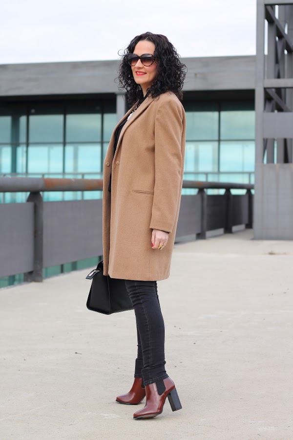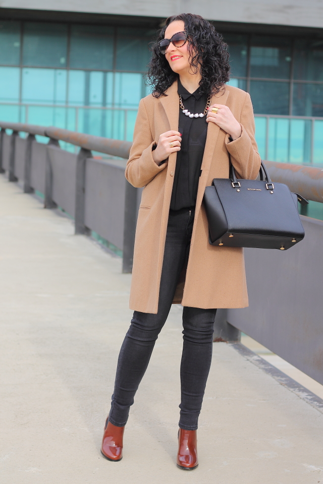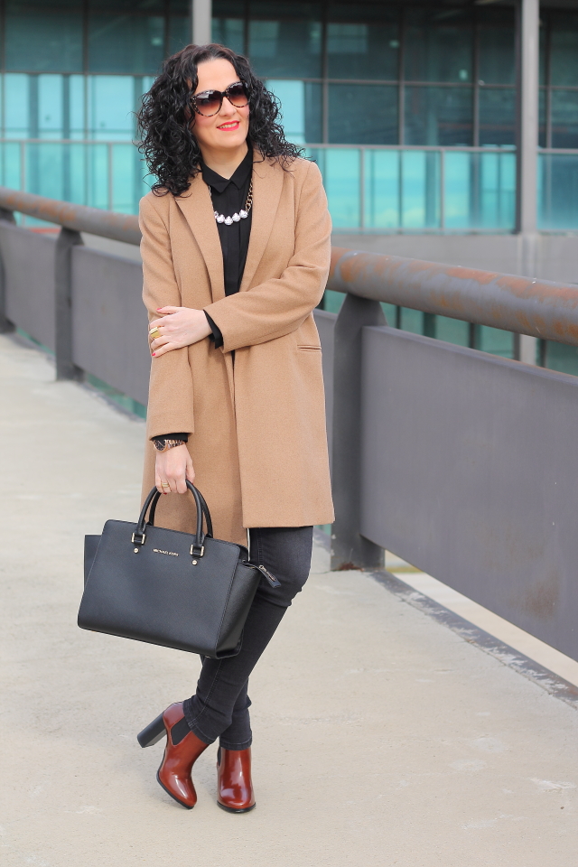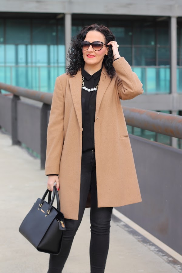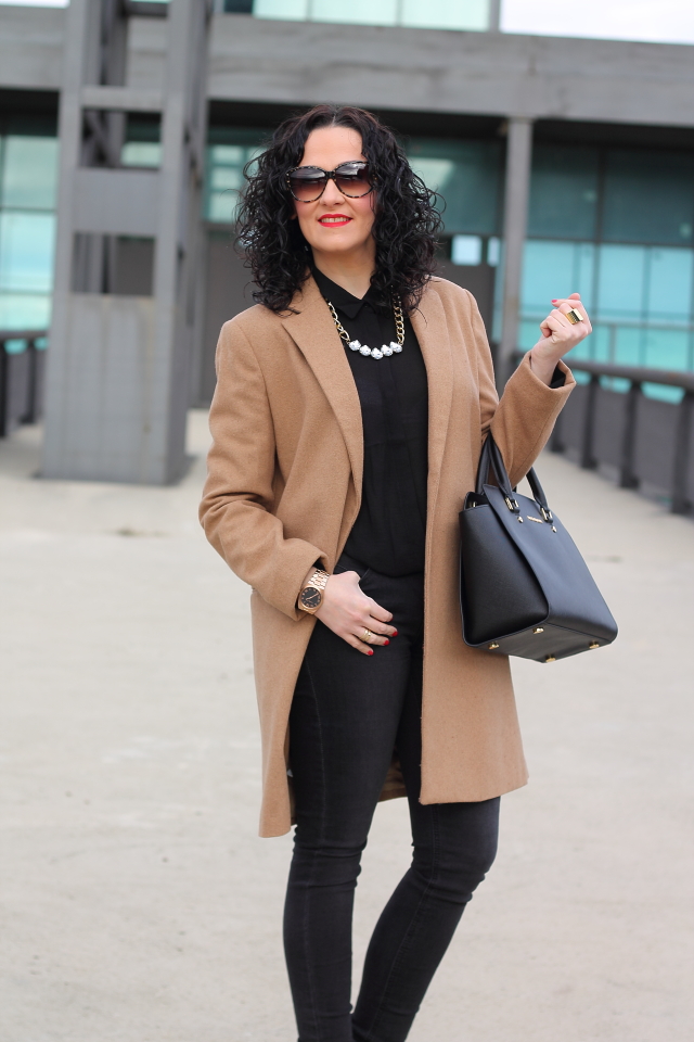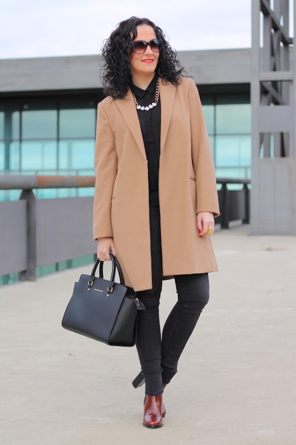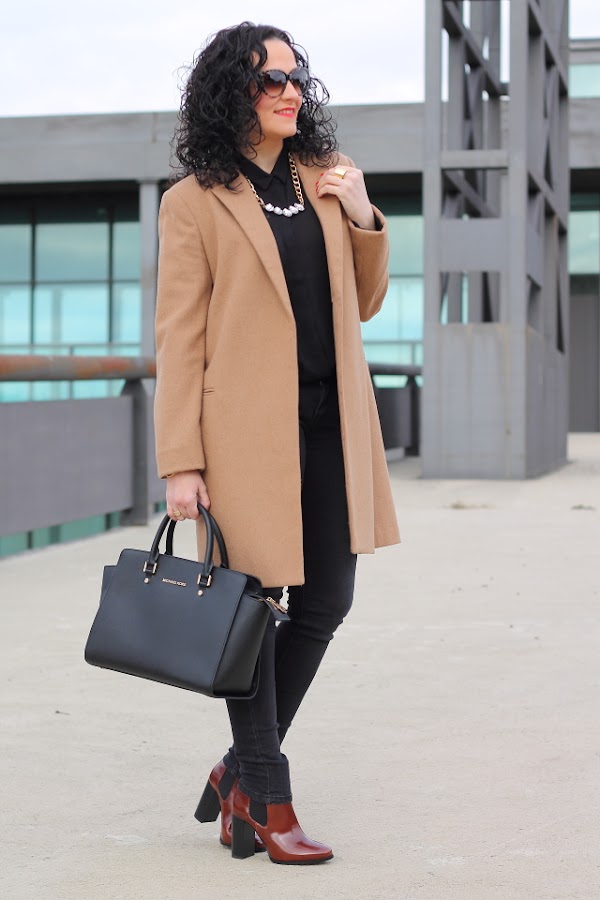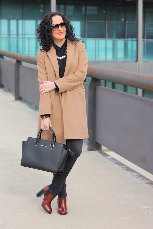 Los que me seguís habitualmente ya sabéis que me caracterizo por llevar looks sencillos y cómodos, donde hago caso a las tendencias en su justa medida y las adapto a mi estilo. Me gusta mucho la moda y me encanta empaparme del street style además, me paso ratos y ratos visitando blogs de moda. Pero aunque los más transgresores me gustan la verdad es que mis favoritos son los que muestran estilismos llevables. Muchas veces veo a chicas con mezclas imposibles que realmente no creo que puedan aplicarse más tarde a nuestra vida cotidiana. Una muestra es el look de hoy, muy sencillo pero a mi me parece perfecto y me encanta. Como siempre he vuelto a confiar en un total look negro haciendo combo con un abrigo cámel y botines marrones. El collar de lagrimas junto con el anillo dorado y el bolso de Michael Kors son los complementos necesarios para darle el toque chic al outfit.