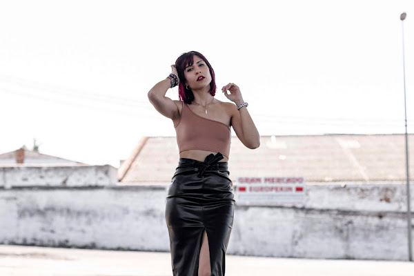 Se trata de un total look de FEMME LUXE, con un crop top asimétrico de color camel (también lo tenéis en rosa claro) y una falda midi de polipiel con una raja en la parte delantera y un cinturón.